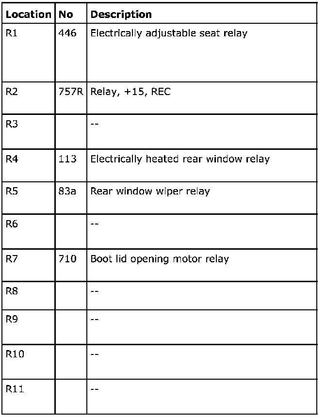 The electrical centre can contain a greater number of relays than those listed below. In such cases, these are not connected to a wiring harness.