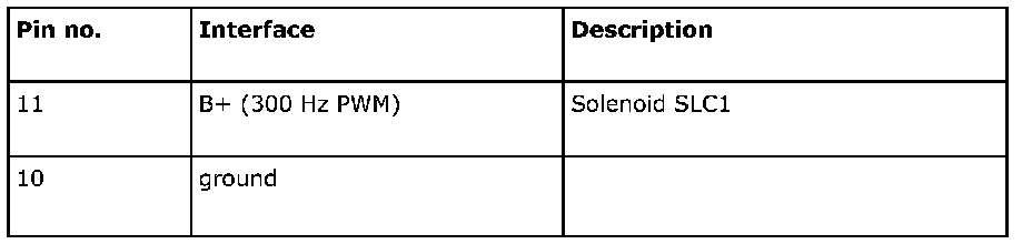 The control module activates the valve by pulsing it with B+ (300 Hz PWM). The valve is powered from control module pin 11 in the connector that makes contact directly with the gearbox on the bottom of the control module. The valve is grounded from pin 10. The current varies between 0- 1000mA. The solenoid is normally open and the hydraulic pressure drops as the current increases.