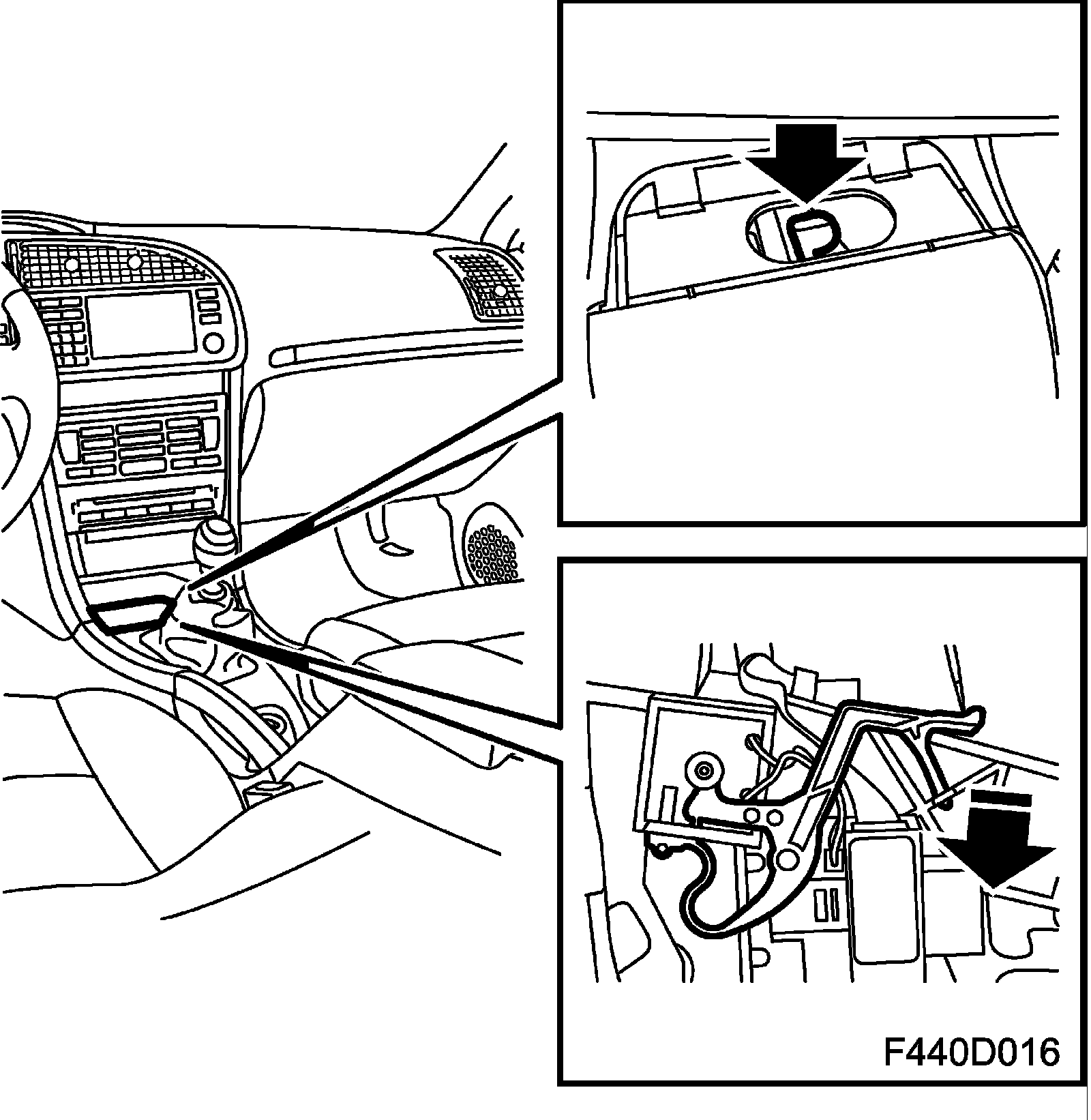 To release the Park Brake Shift-lock in case of an electrical fault, proceed as follows: Press a screwdriver or similar into the hole in front of the lever housing and move the lever.