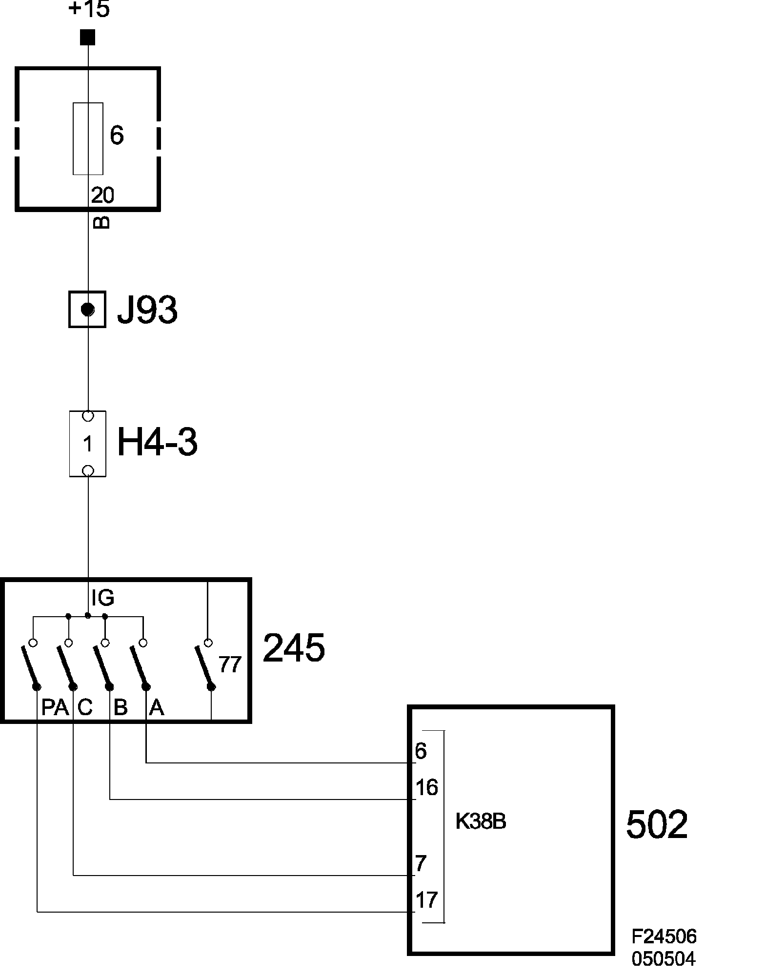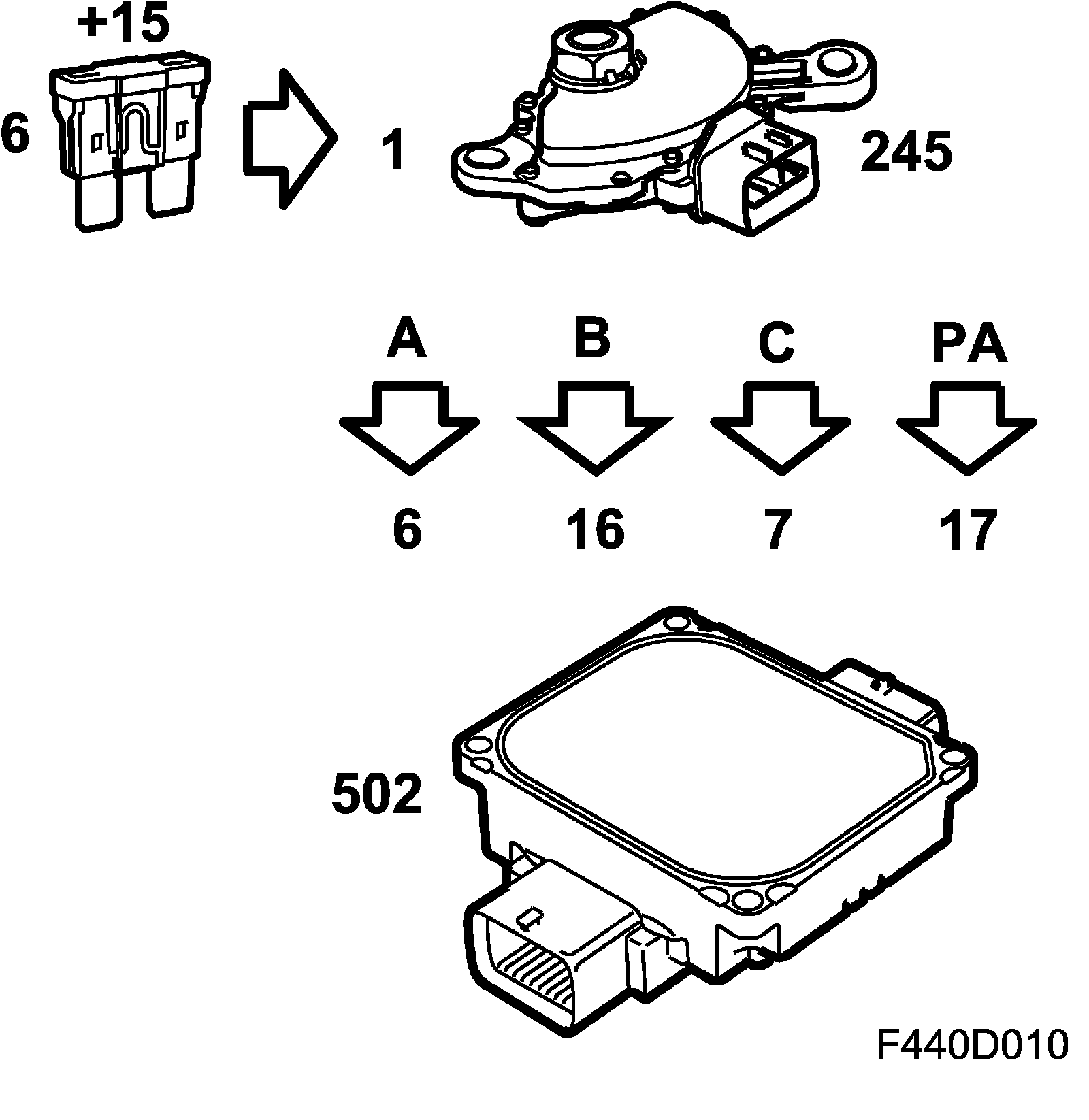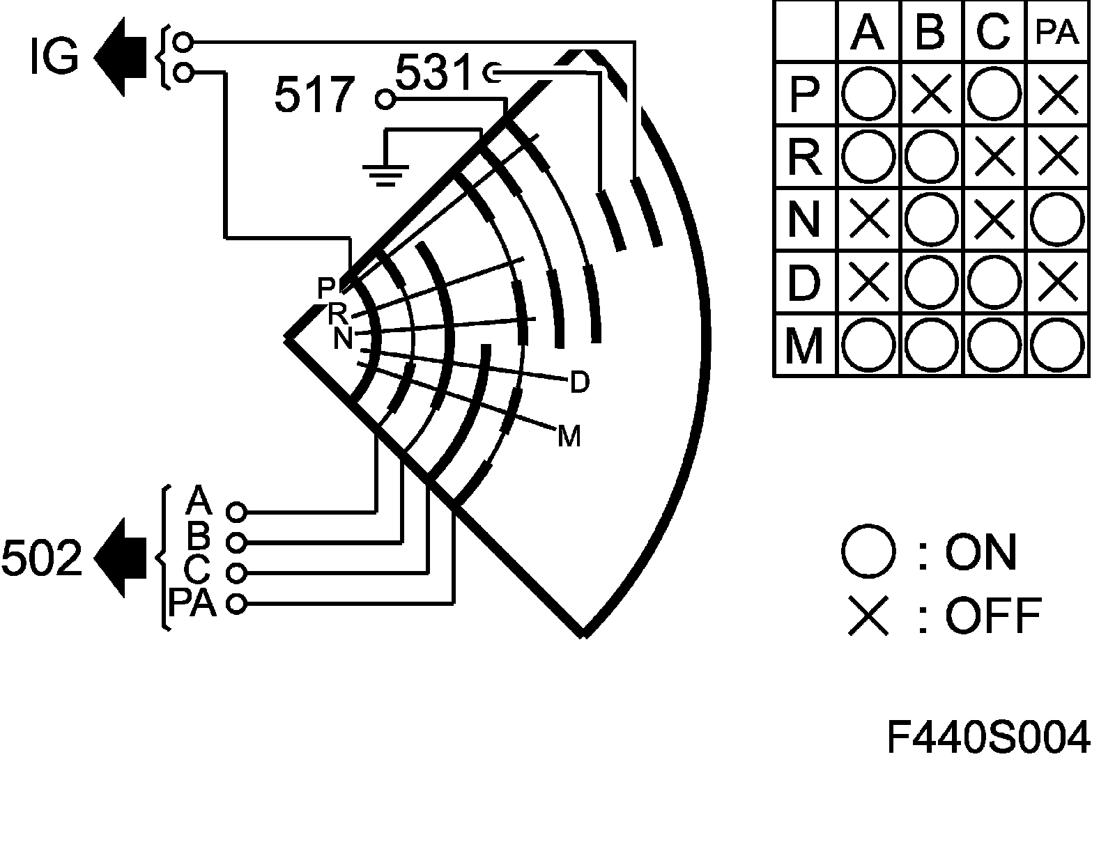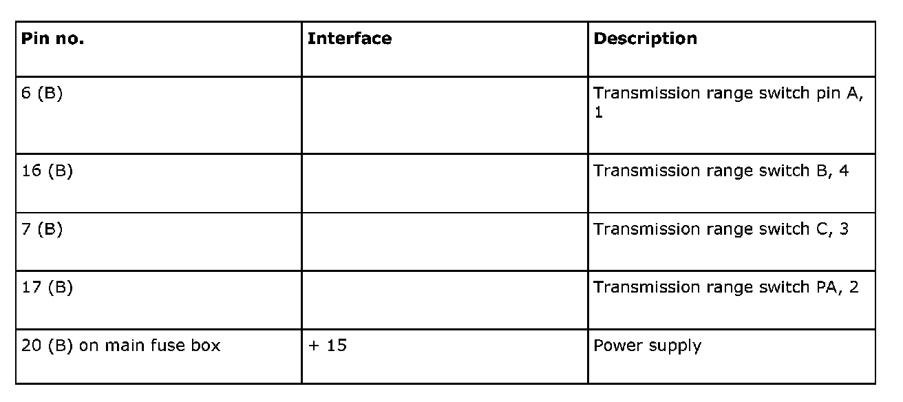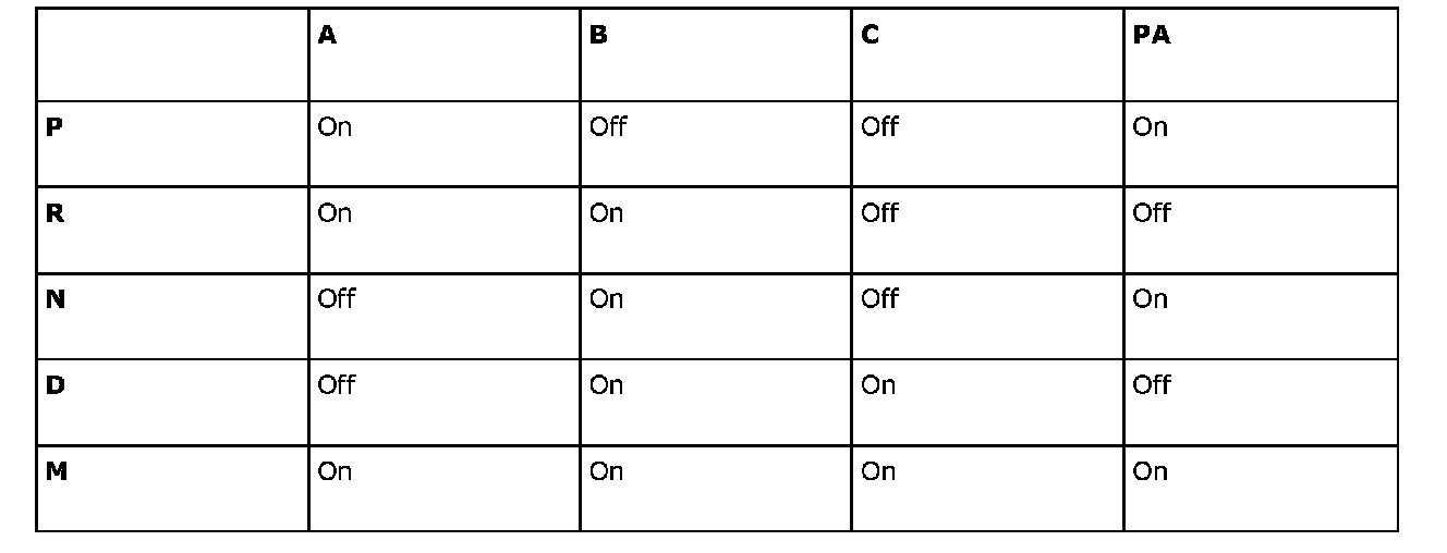 The transmission range switch is a position switch that is powered via +15 from fuse 6 in Rear electric center 342. A number of slip contacts provide the current to the sensor outputs. A combination of terminals A, B, C and PA provide the current selector lever position (see table). The slip contacts can be either closed (ON) or open (OFF).