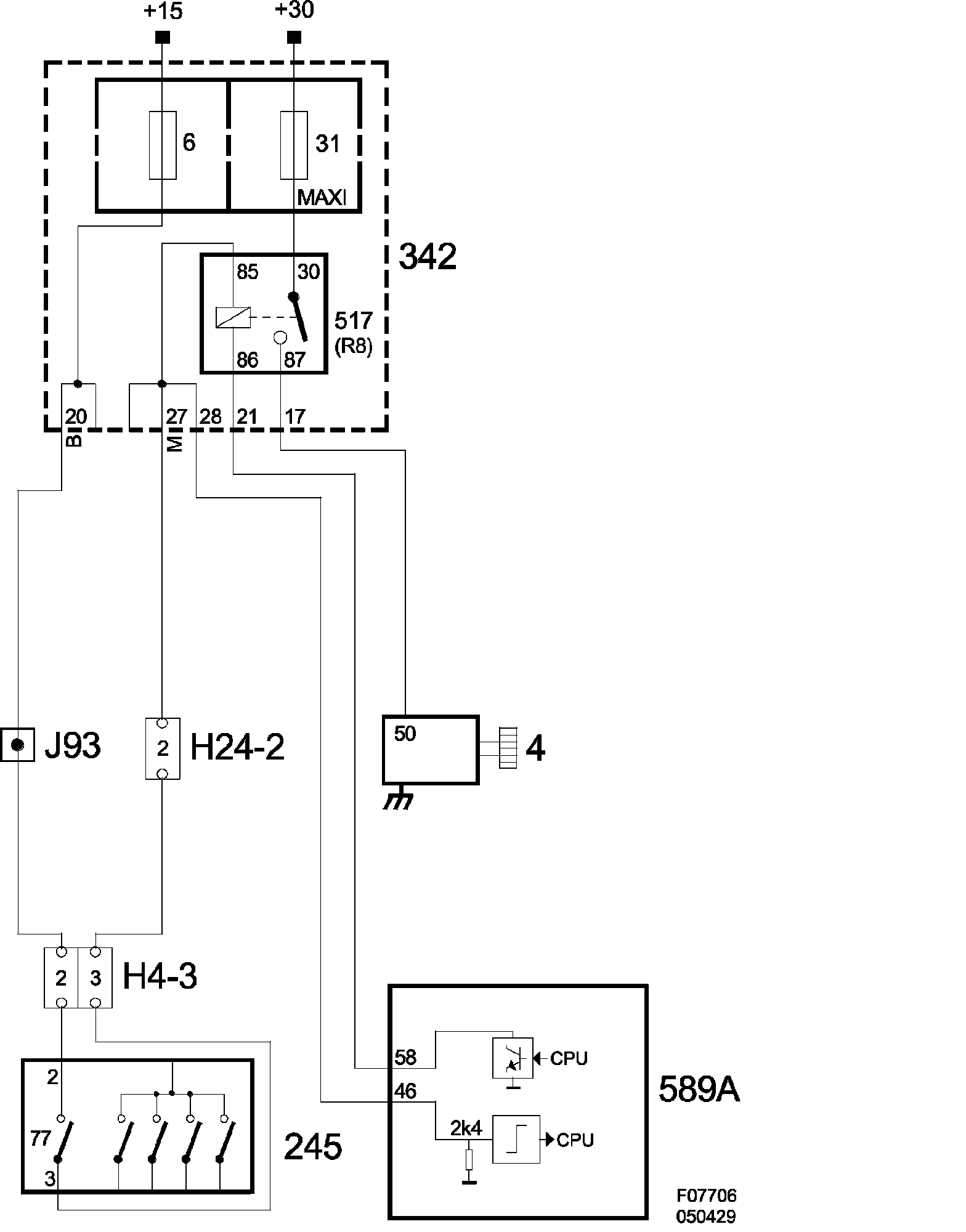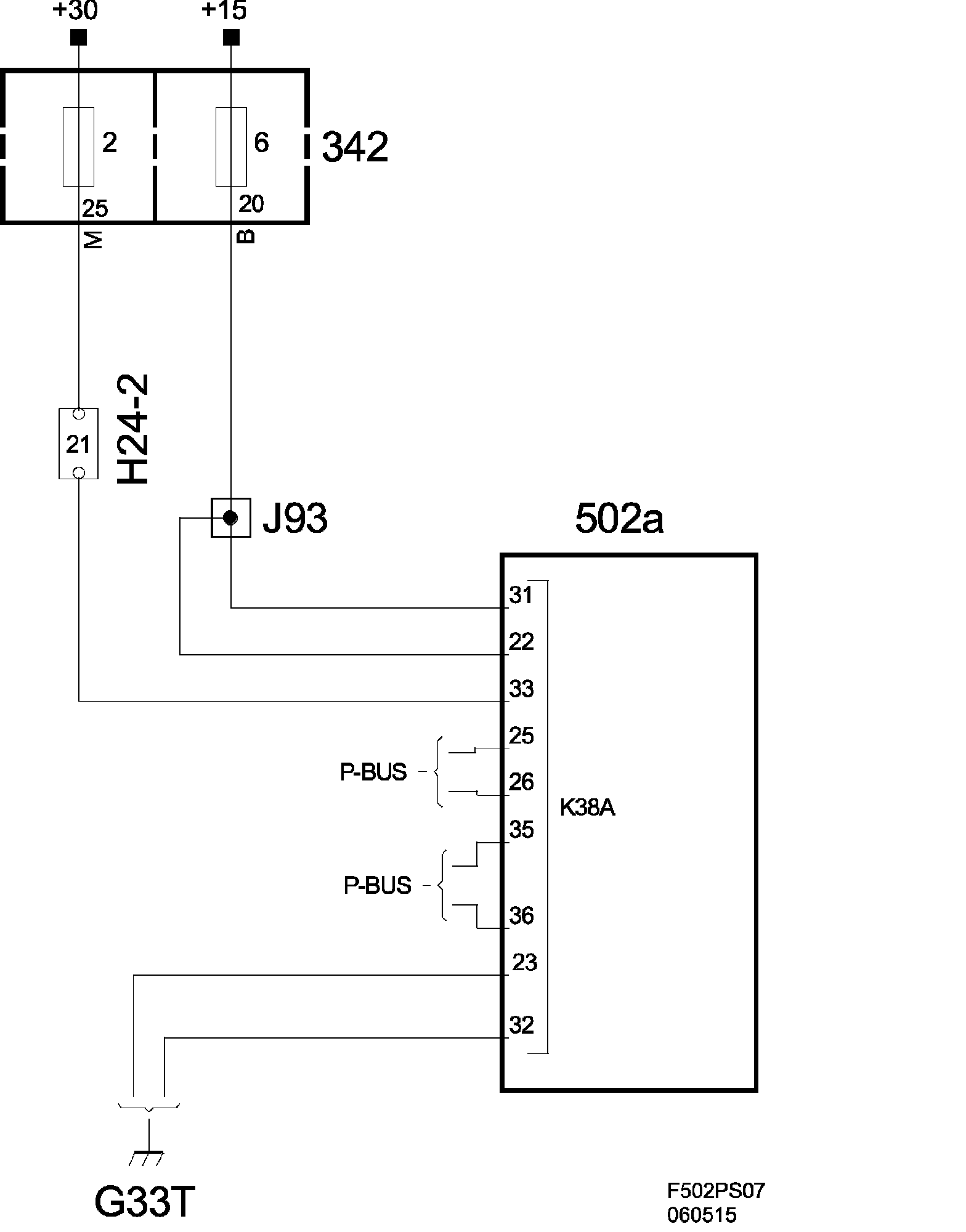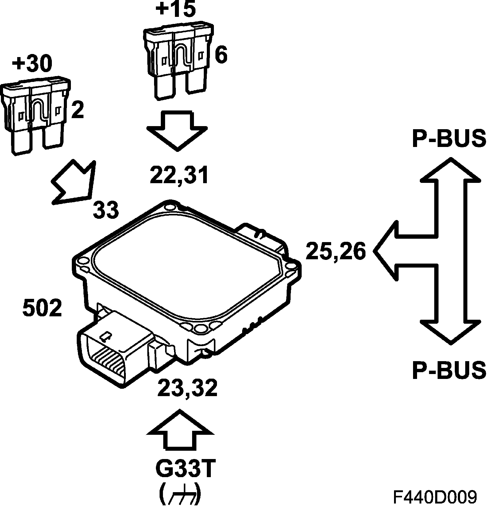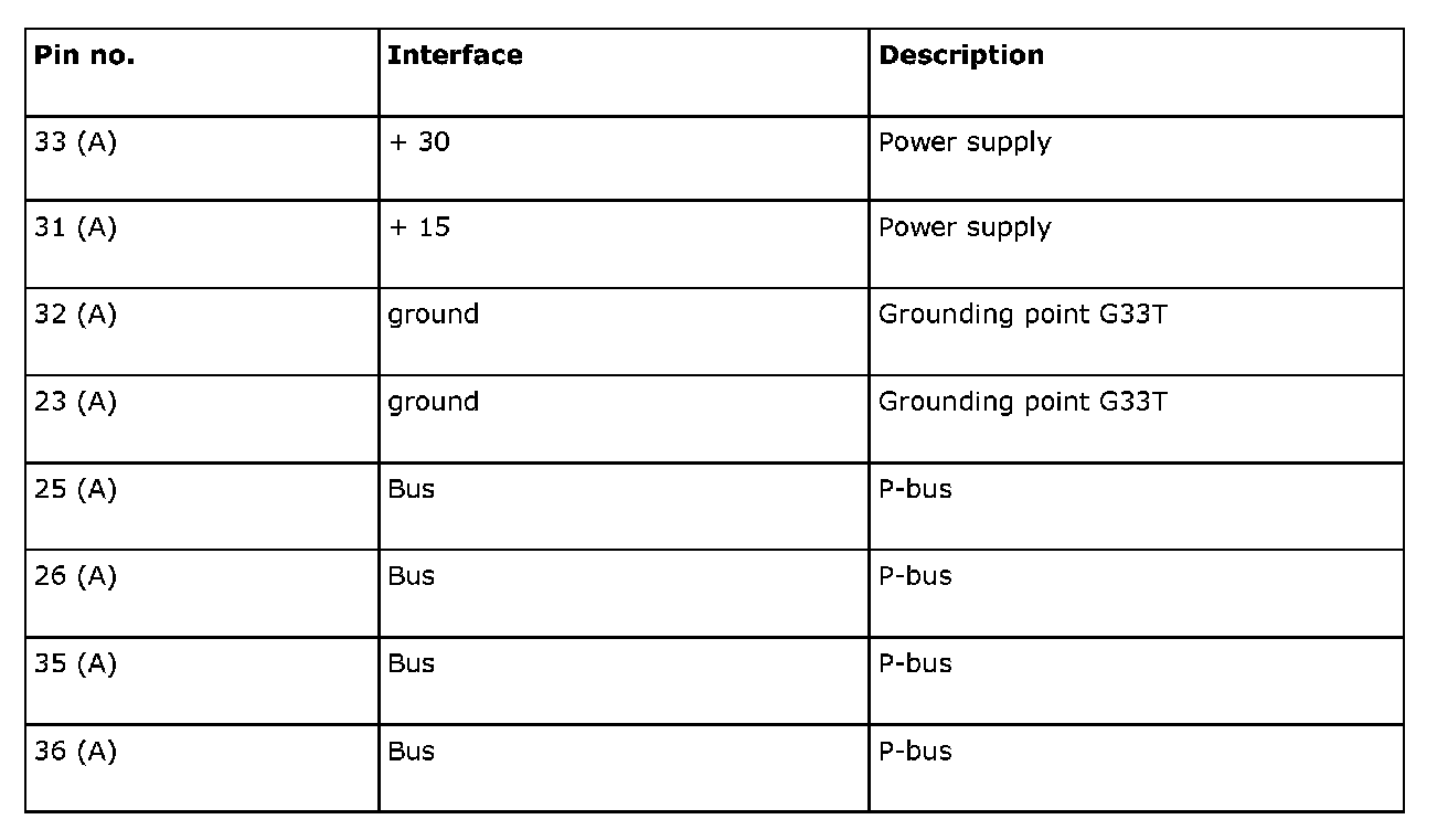 The control module is powered on pin 33 (A) with +30 voltage and on pins 31 (A) and 22 (A) with +15 voltage. The module is grounded via pins 32 (A) and 23 (A) to grounding point G33T. Bus communication (P-bus) takes place on pins 25-26 (A) and 35-36 (A).