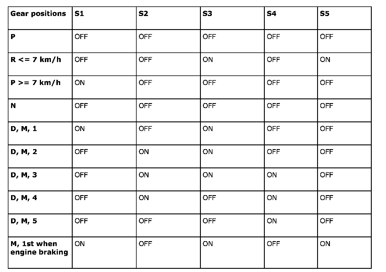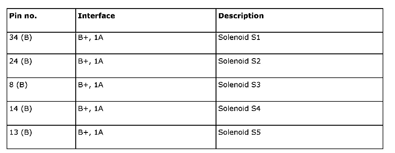 The control module activates S1-S5 by making or breaking the circuit to B+. The solenoids are supplied with 0A or 1A from the control module (TCM). Grounding takes place through the solenoid casings.