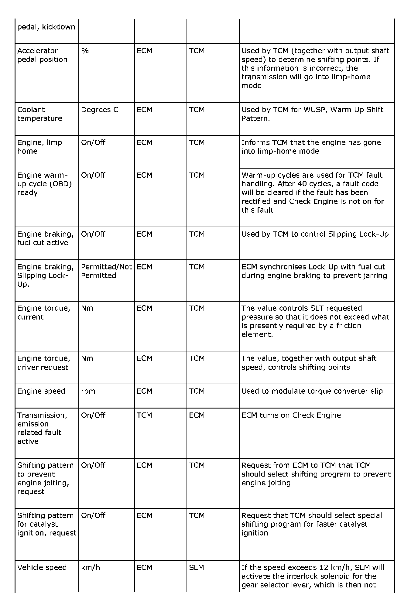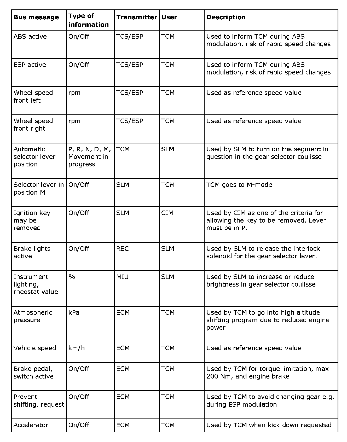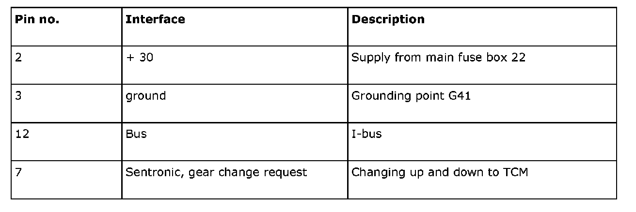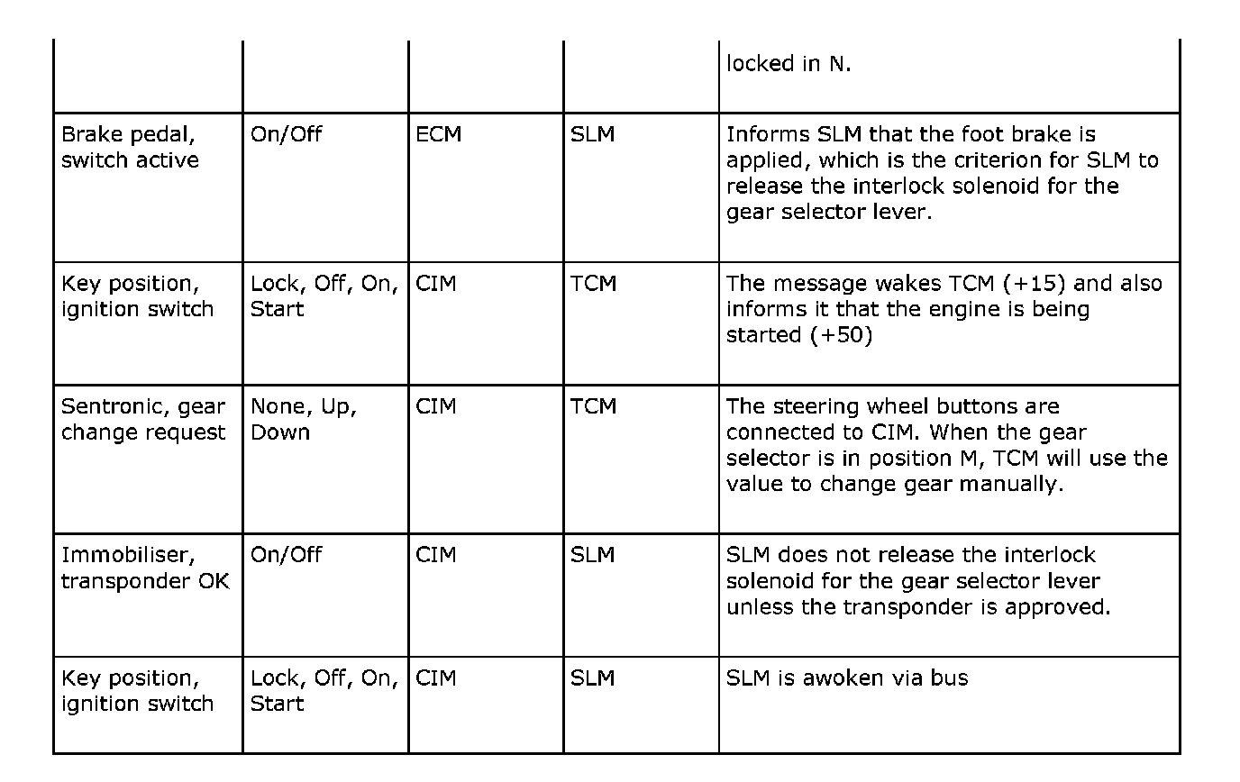 Communication regarding gear changes up or down in position "M" takes place from pin 7 on the SLM to pin 3 on TCM for FA 57 respectively pin 8 on TCM for AF 40.