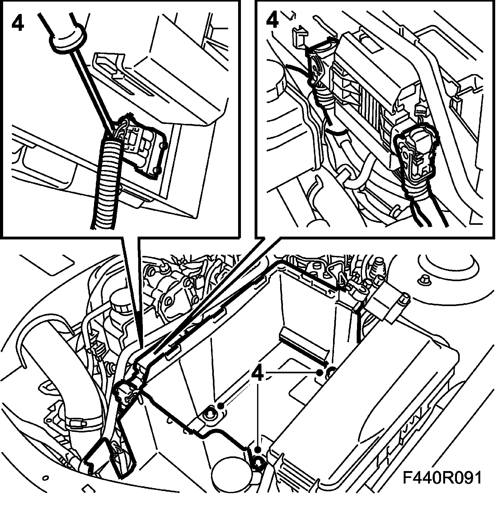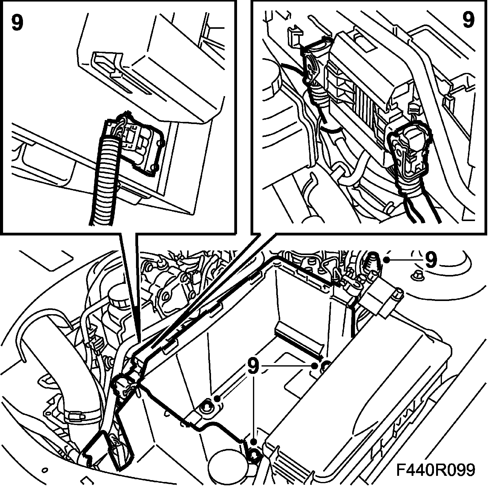 9. Plug in the connectors under the control module. Plug in the control module connector and fit the bonnet switch and battery tray.