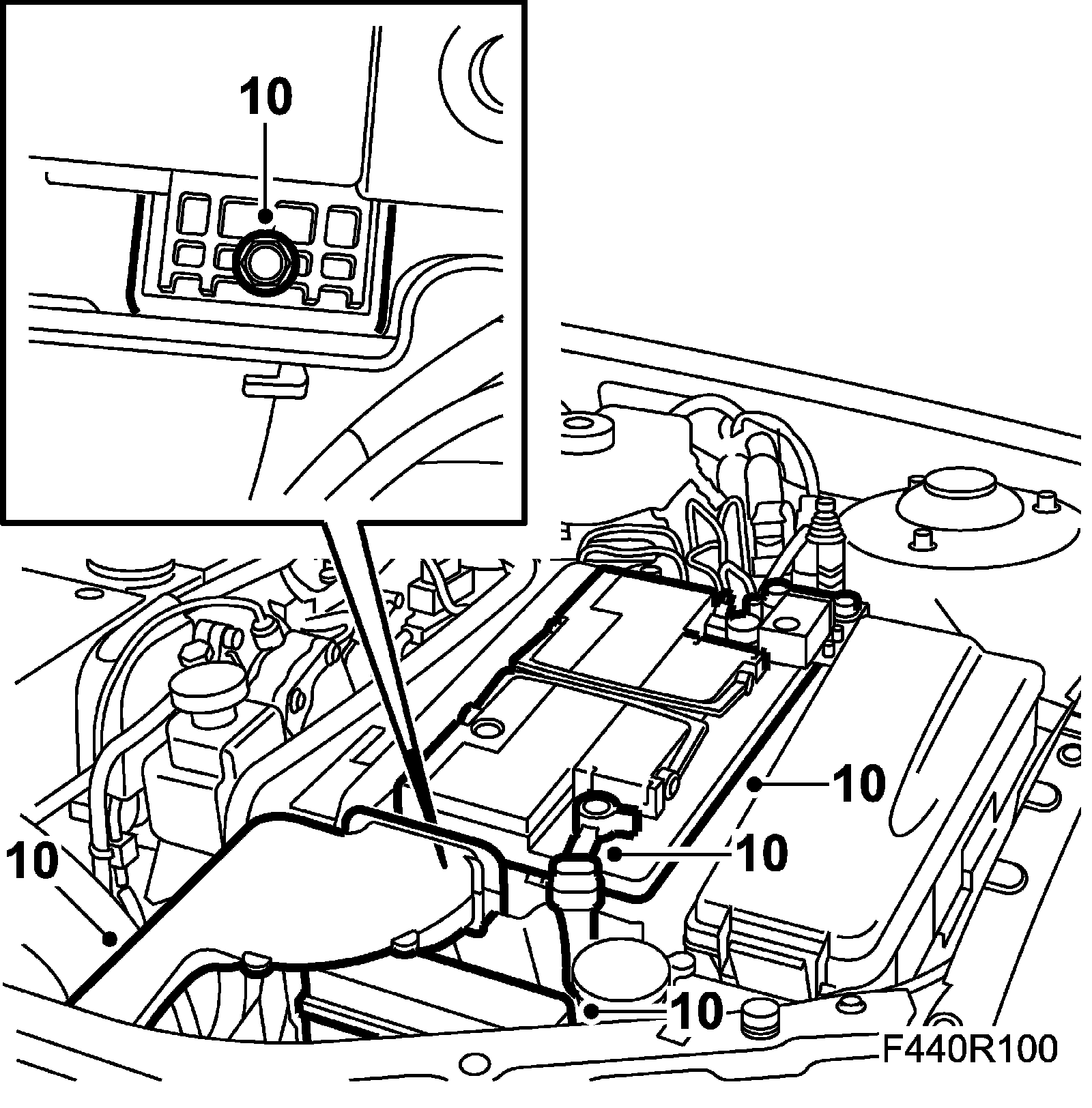 10. Fit the cooling pipe, main fuse box and battery. Connect the battery cables.