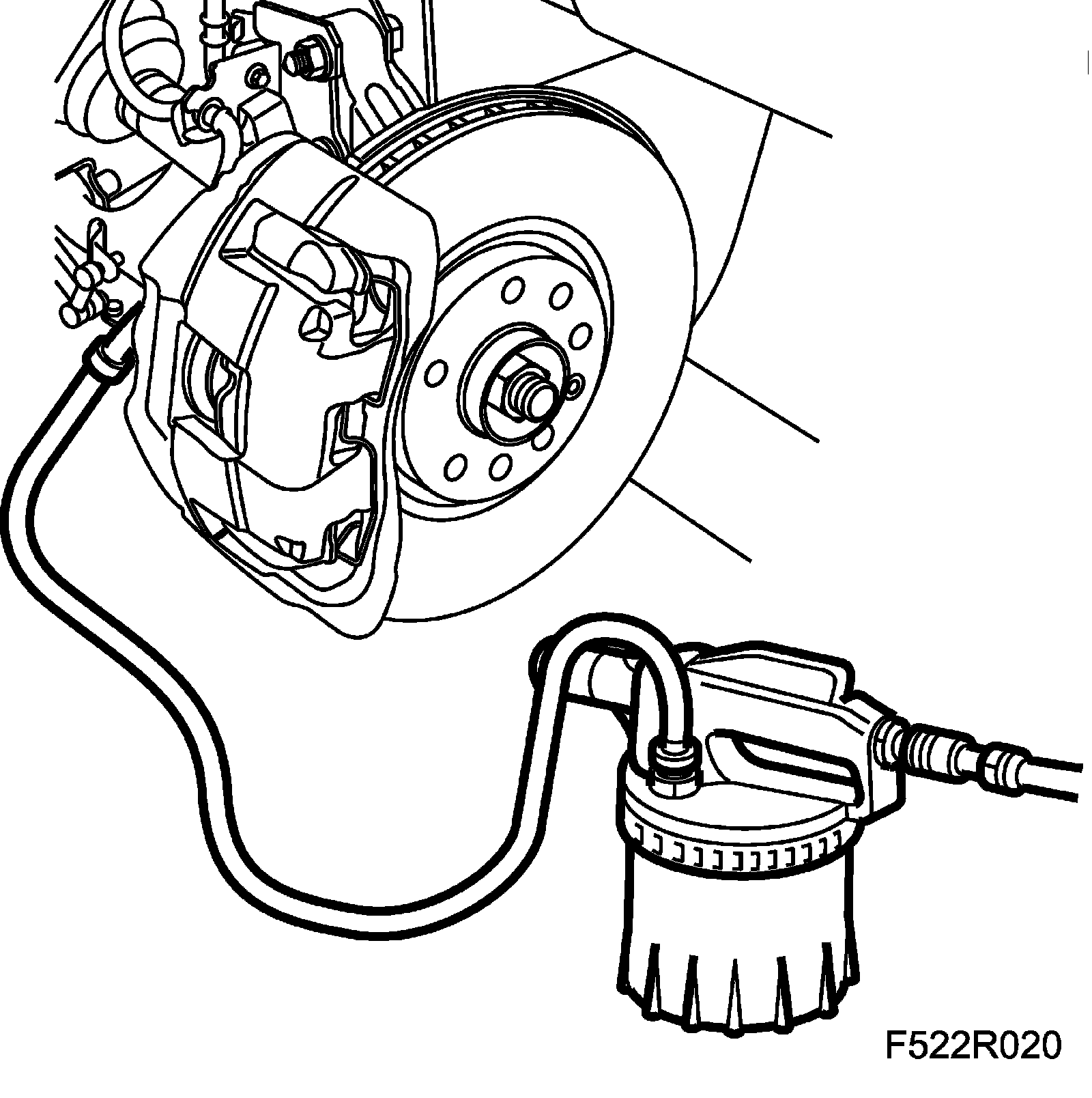 2. Raise the car. Connect the bleeder hose to the air nipple on the front left brake caliper and open the nipple. Drain about 100 ml brake fluid. Use 88 19 096 Bleeding equipment.