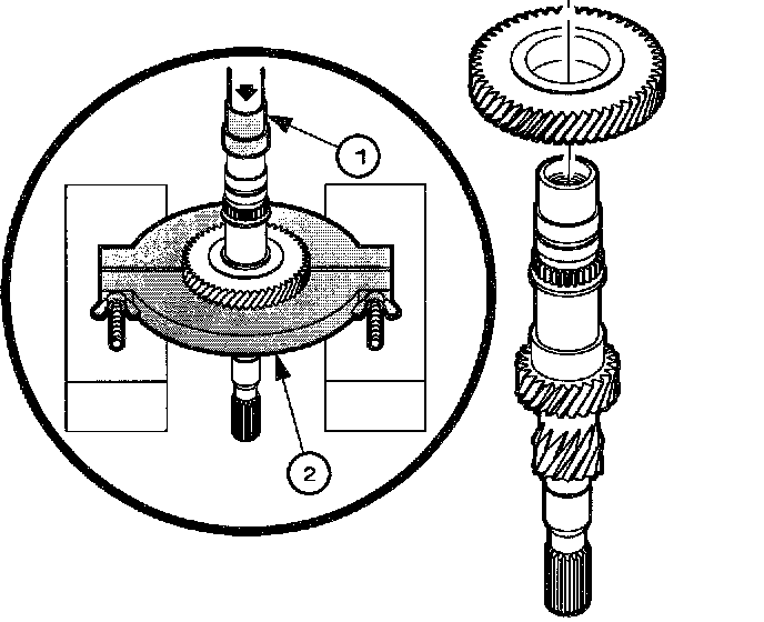 9. Press off 5th gear using Press Adapter J44378 (1), a separator plate J36513 (2) and a hydraulic press.