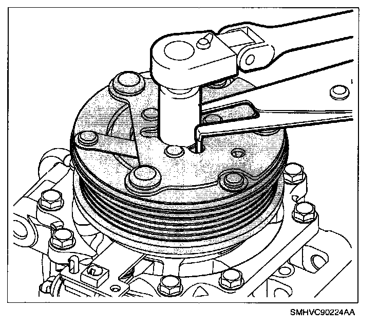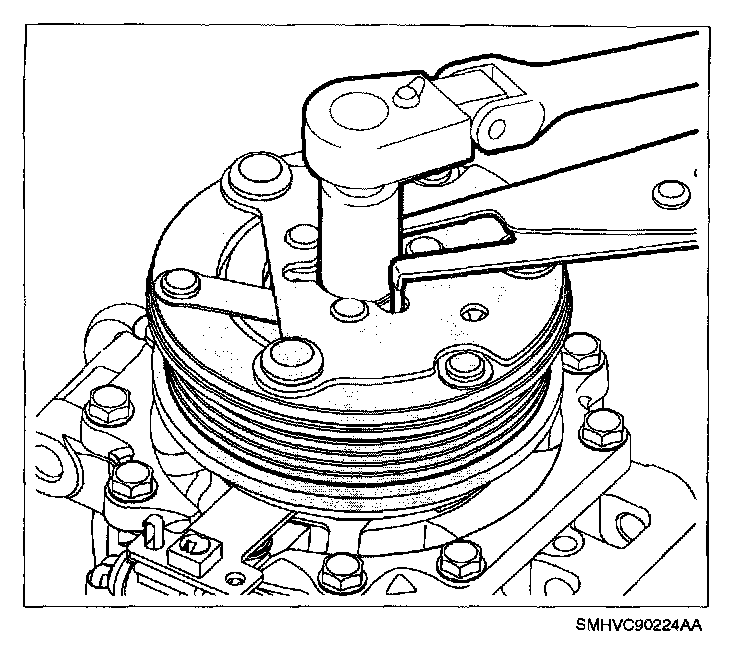 2. Use A/C Clutch Holding Tool J 45267 to hold disk & hub assembly. Remove clutch nut and disk & hub assembly.