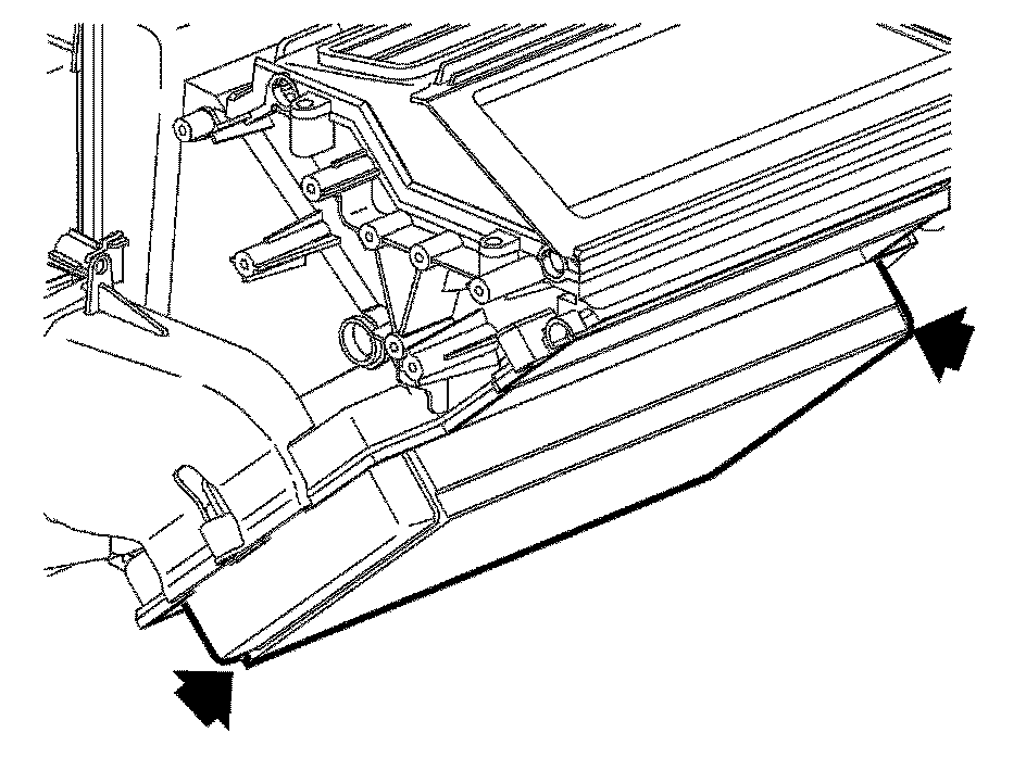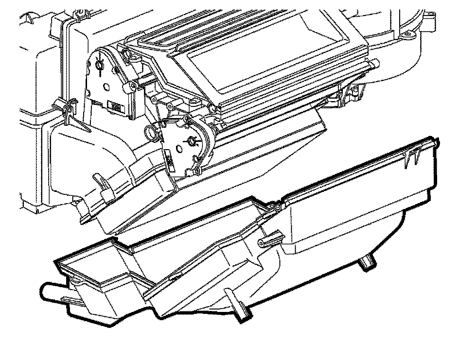 13. Grasp the heater core at end tanks and remove heater core. Spray the perimeter of the heater core seal and the heater core pipes at the front of dash with a soap and water mixture to ease removal.