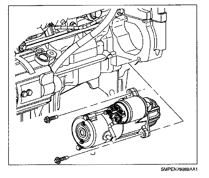 7. Move starter right, clearing engine block, then left and out of engine block (flywheel housing).