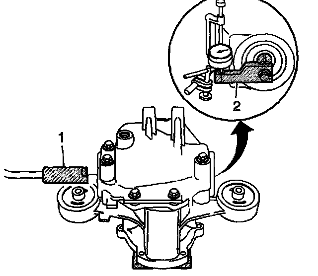 17. Attach the dial indicator to the housing. Measure from the line marked on J 44856-7 (2). Zero out the dial indicator.