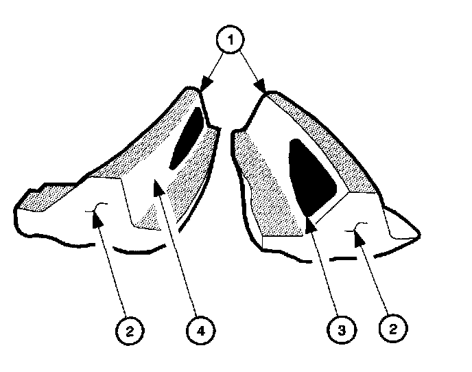 The side of the ring gear tooth which curves outward, or is convex, is the drive side (4). The concave side is the coast side (3). The end of the tooth nearest the center of the ring gear is the toe end (2). The end of the tooth farthest away from the center is the heel end (1).