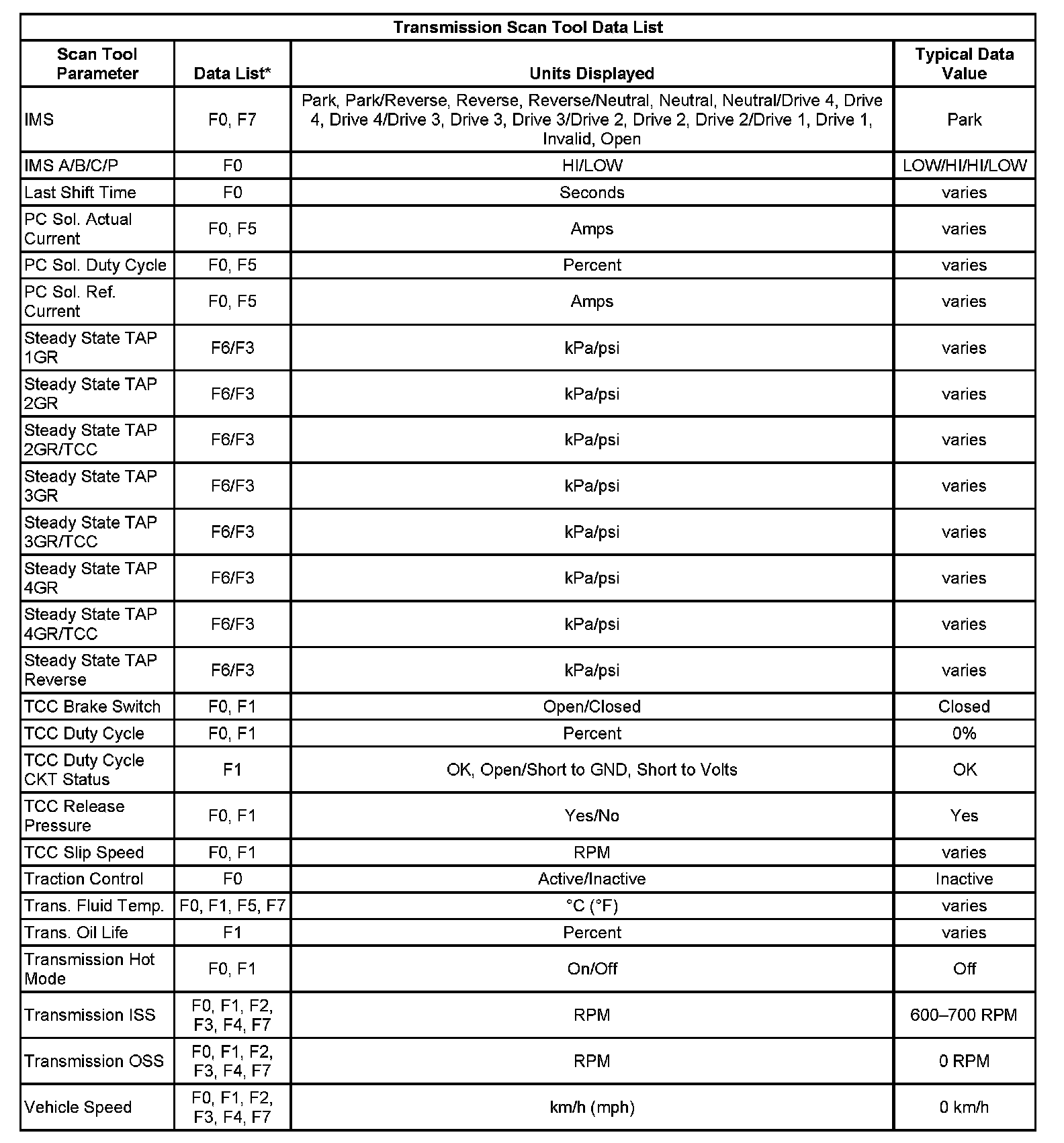 Only the parameters listed below are used in this manual for diagnosing. If a scan tool displays other parameters, the values are not recommended by General Motors for use in diagnosis.