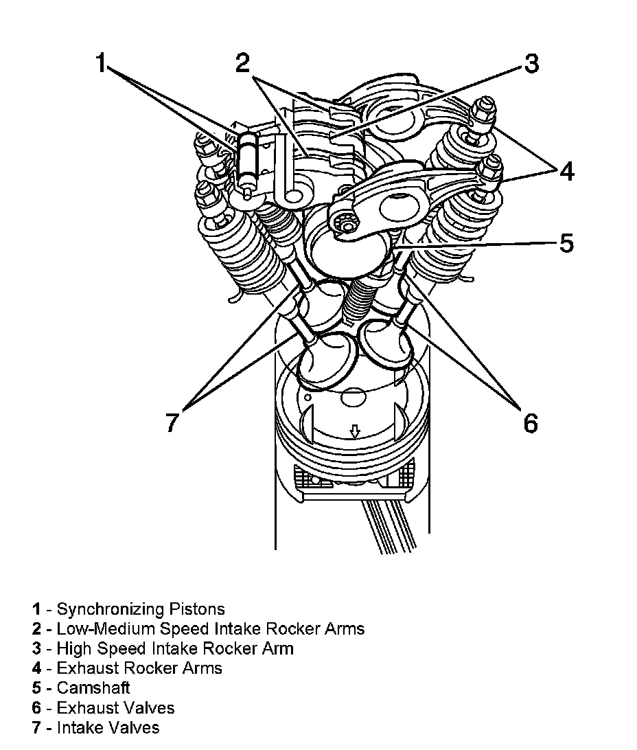 The three intake rocker arms (2 and 3) ride on rocker arm shafts as do the two exhaust rocker arms (4). The rocker arm shafts supply engine oil to the rocker arms. When the flow of oil to the rocker arms increases, the synchronizing pistons (1) move and lock the three rocker arms together. With all three rocker arms locked together, the high speed cam lobe opens and closes the intake valves (7).