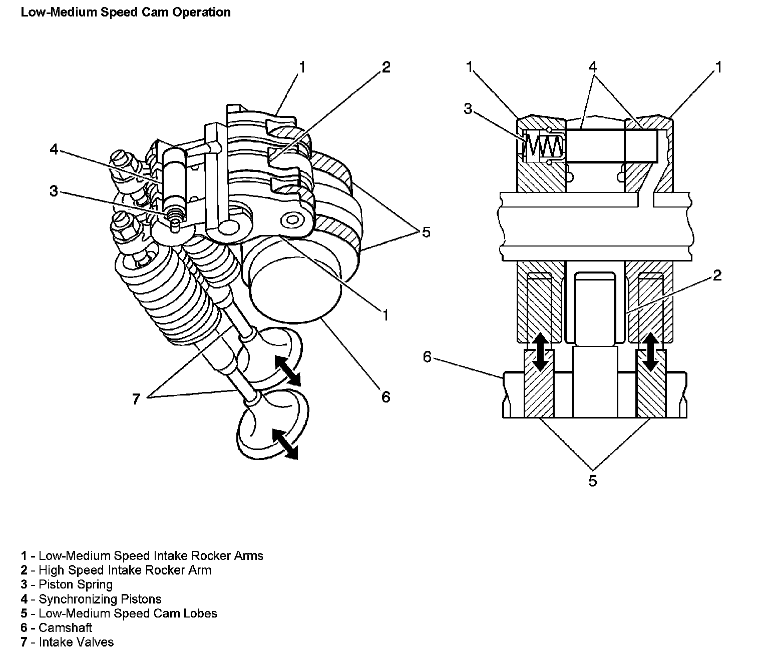 At engine speeds below 4,400 RPM, the low-medium speed cam lobes (5) open and close the intake valves (7) thru the low-medium speed rocker arms (1). During low-medium speed operation, the rocker arm oil control solenoid is OFF and there is no oil flow to the rocker arms. Without oil flow there is no oil pressure, and the piston spring (3) keeps the synchronizing pistons (4) at rest in their bores within the three rocker arms (1 and 2). This allows the high speed rocker arm (2) to move independently of the two low-medium speed rocker arms (1) while following the high speed cam lobe.