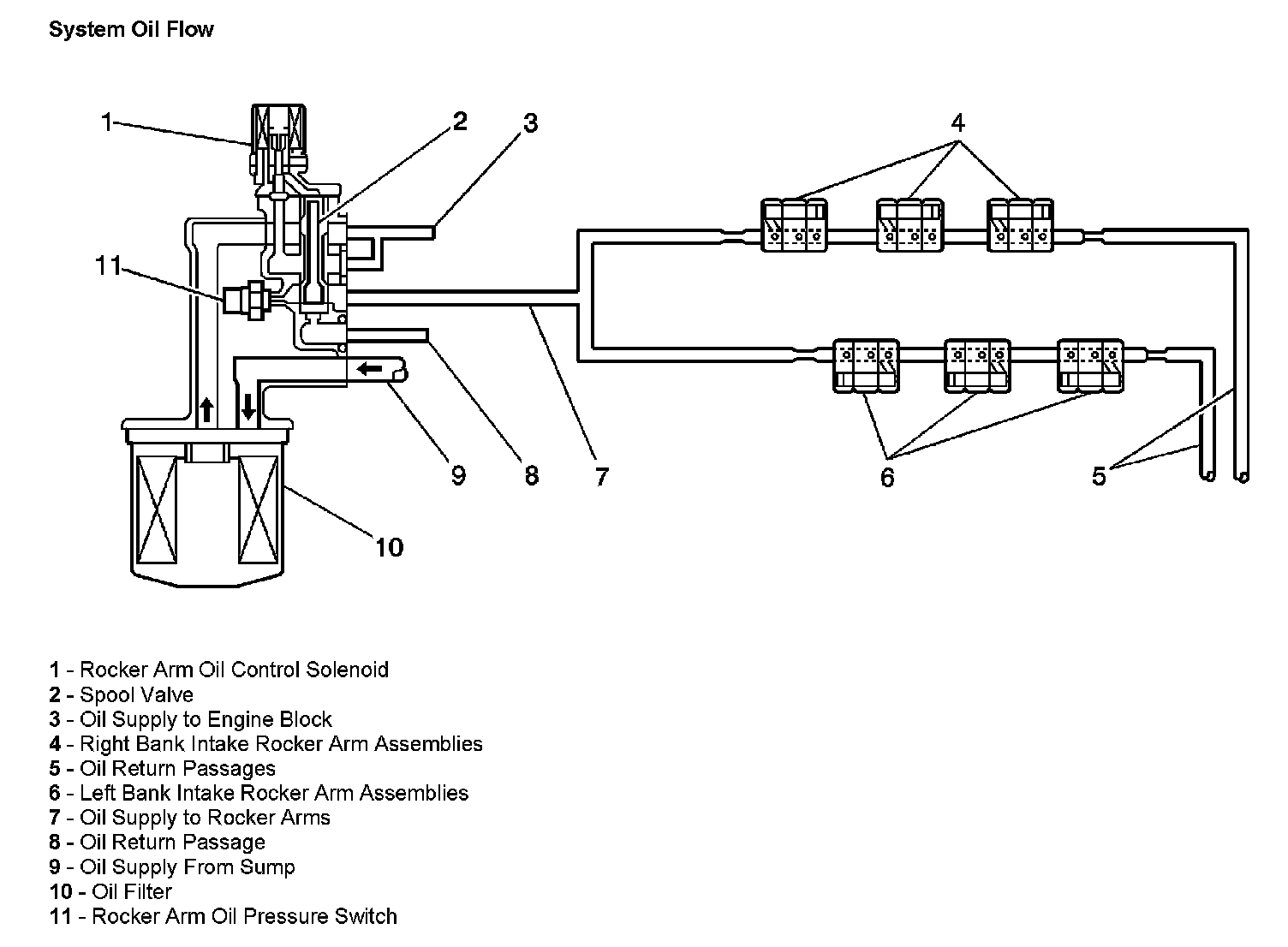 The flow of engine oil thru the rocker shafts to the intake rocker arms (4 and 6) is controlled by the rocker arm oil control solenoid (1). The oil control solenoid (1) has a plunger that moves a spool valve (2) located in the path of the rocker arm oil supply (7). When the oil control solenoid is energized, the spool valve is positioned to allow maximum oil flow to the intake rocker arms. Because of the restriction to full oil flow in the rocker arm oil passages, oil pressure increases. Excess oil is returned to the oil pan thru the oil return passages (5). The rocker arm oil pressure switch (11) detects oil pressure when the rocker arm oil control solenoid (1) is ON. The oil pressure switch input enables the engine control module to monitor the operation of the rocker arm oil control solenoid.