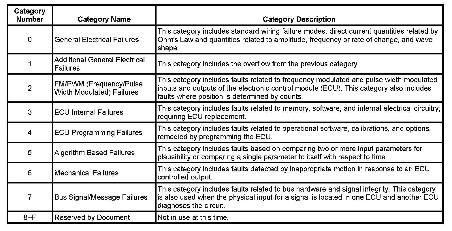 The DTC symptom is made up of 2 alphanumeric digits. The first digit following the DTC indicates the DTC symptom category. There are 16 possible categories available in the range of 0 through the letter F. Currently there are 8 categories in use, 0 through 7. These 8 categories together with their definitions are given.