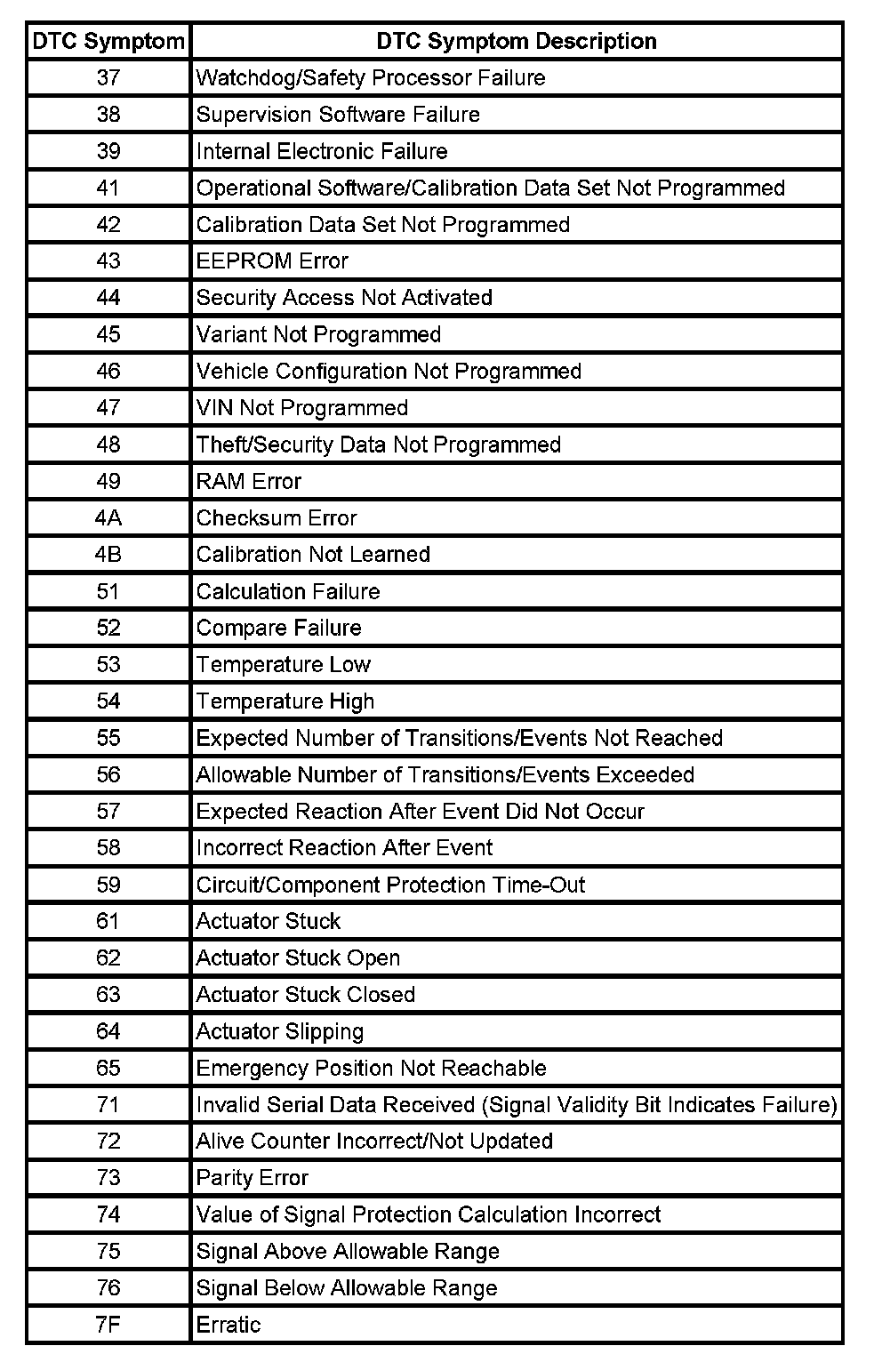 A DTC symptom is a 2-digit number which adds additional detail to a DTC. The DTC symptom provides additional information without requiring a large increase in the number of new DTCs.