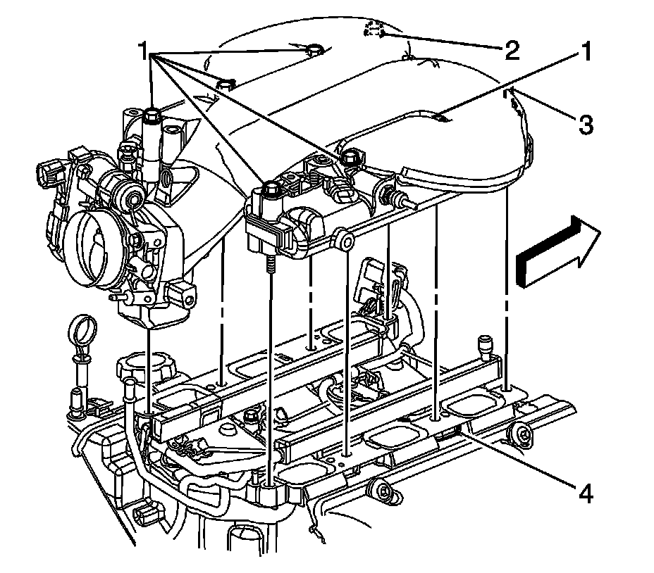 12. Install the upper intake manifold bolts (1, 2) and stud (3).