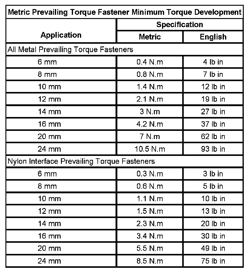 Metric Prevailing Torque Fastener Minimum Torque Development