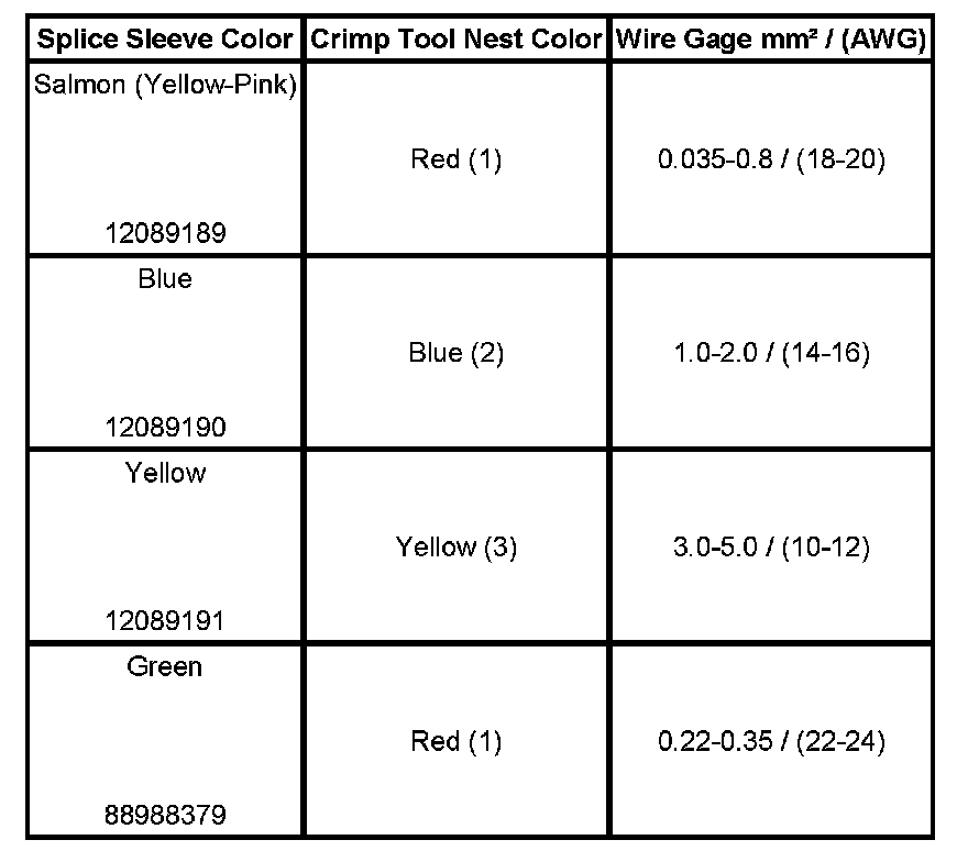 4. Select the proper DuraSeal splice sleeve according to the wire size. Refer to the above table at the beginning of the repair procedure for the color coding of the DuraSeal splice sleeves and the crimp tool nests.