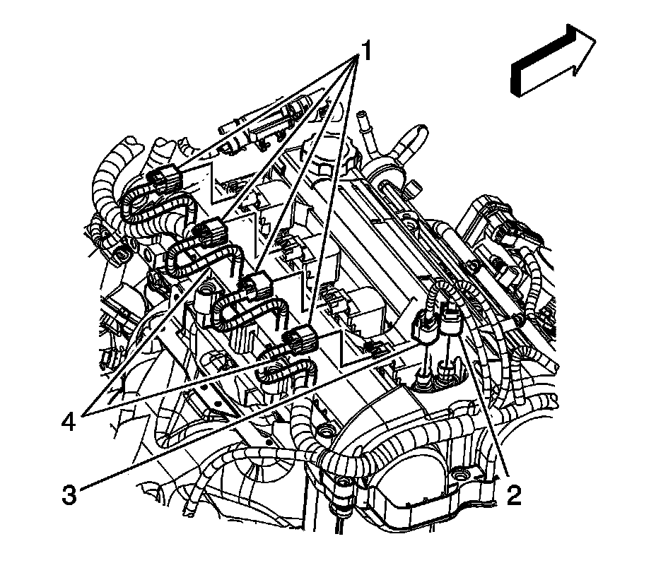 2. Disconnect the engine wiring harness electrical connectors (2, 3) from the appropriate camshaft position (CMP) actuator solenoid valve.