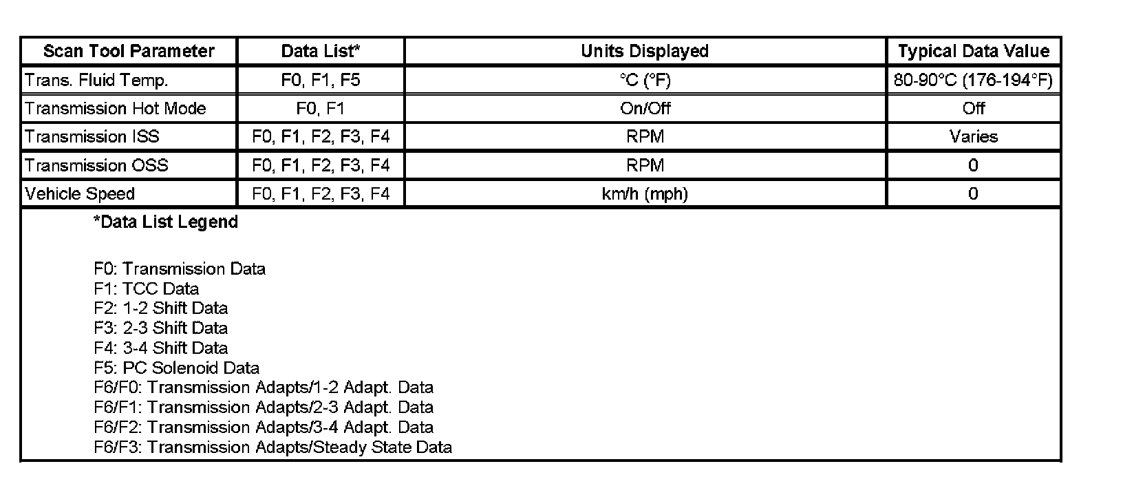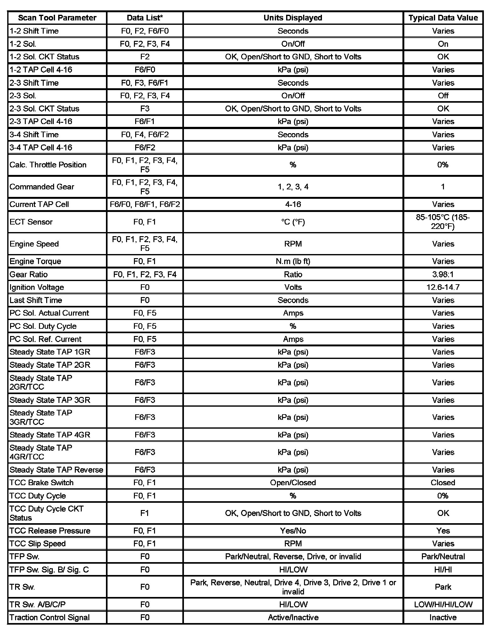 Only the parameters listed below are used in this manual for diagnosing. If a scan tool displays other parameters, the values are not recommended by General Motors for use in diagnosis.