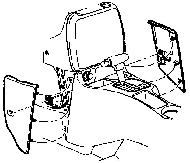 8. Install left and right lower trim panel extensions by inserting hinges into console openings. Then rotate closed and push in at dual lock locations.