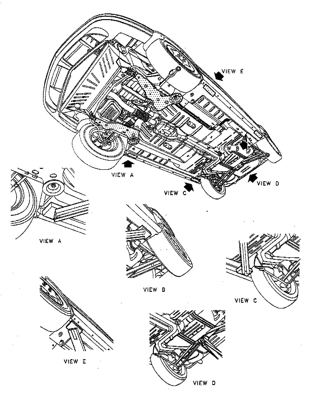 When lifting with a suspension contact hoist, position the front structure under the front lower control arms. Position the rear structure under the rear knuckles.