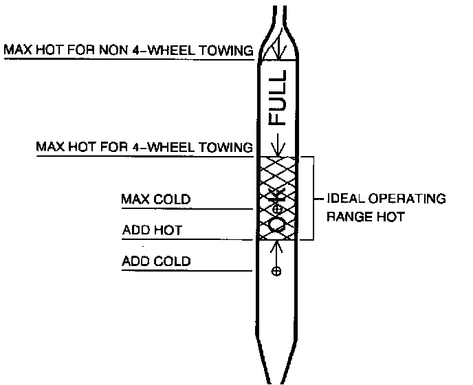 IMPORTANT: If it is necessary to remove transaxle fluid from the transaxle in order to achieve the desired level for four-wheel towing, it will not be necessary to add transaxle fluid when not towing the vehicle. This is provided so the transaxle fluid level falls in the cross-hatched area when checked at the proper temperature.