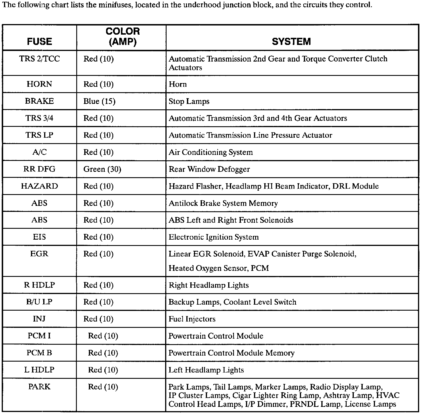 Underhood Junction Block Charts: Minifuses Circuit Feeds: