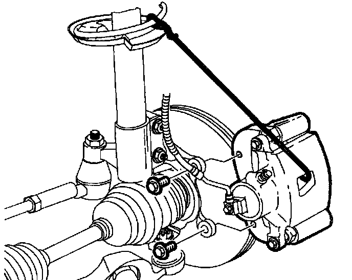 3. Remove caliper support to steering knuckle bolts; remove caliper assembly and suspend it from the strut spring with mechanics wire.