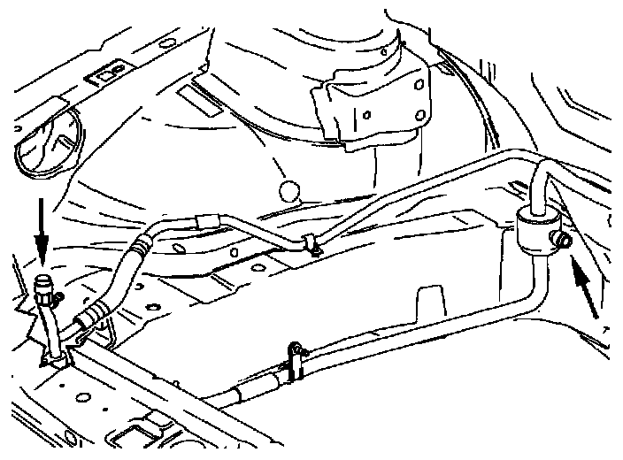 The A/C refrigerant system has a high pressure (discharge) and a low pressure (suction) service fitting valve. These valves provide access to both sides (high and low pressure) of the system. Always reinstall the protector cap on the service fitting valves after servicing the A/C system, to prevent refrigerant from escaping.