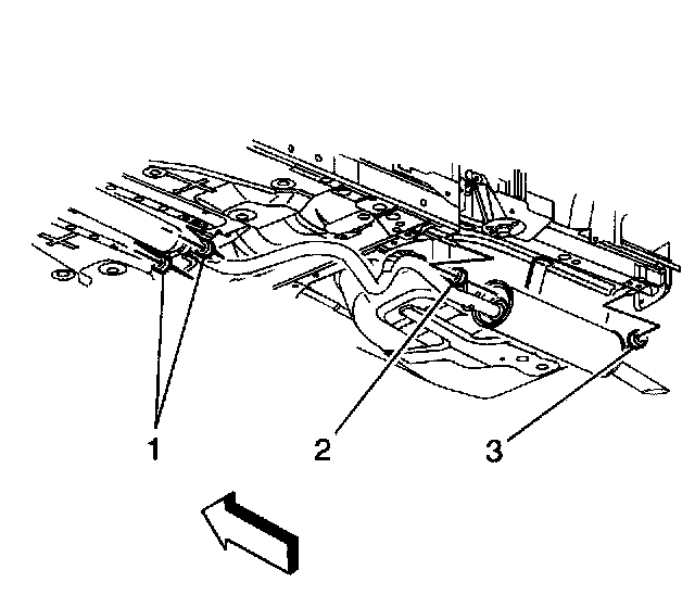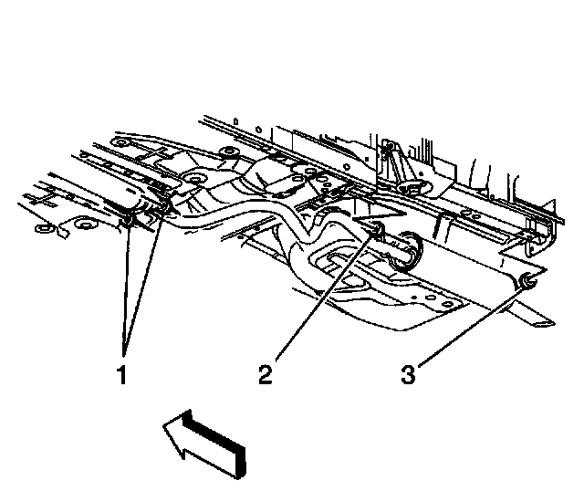 3. Release the muffler insulator (3) from the underbody hanger and slowly lower the exhaust to rest on the rear axle beam.