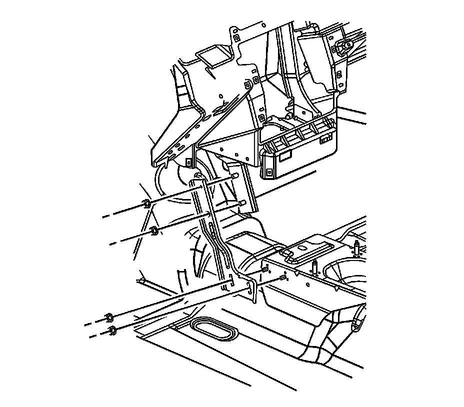 2. Pull back the carpet at the bottom of the left I/P center support bracket and remove the left I/P center support bracket nuts.