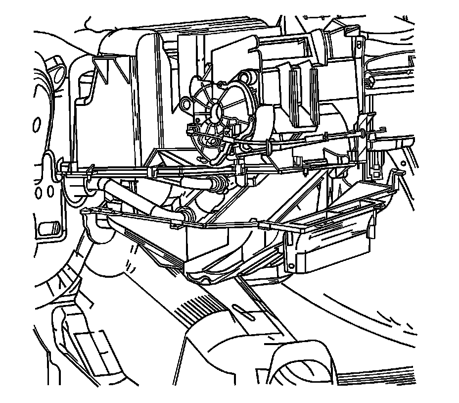 2. Install the heater core cover from the right side. Slide up and forward into position. Align the drain tube with the hole in the front of dash. Raise the heater core cover into position while aligning holes with the locating pins from the HVAC module.