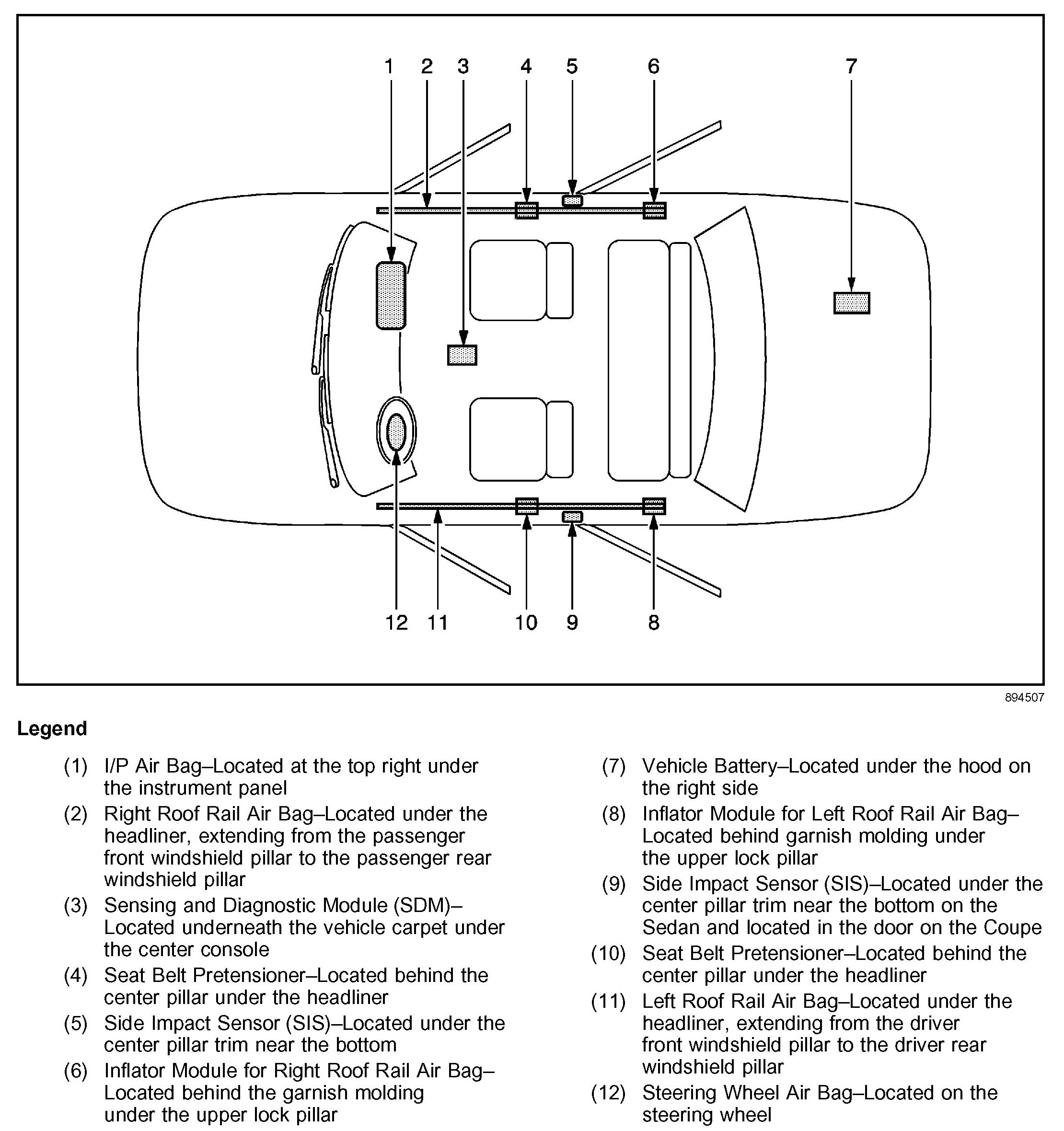 SIR Zone Identification ViewsThe SIR Zone Identification Views shown below illustrate the approximate location of all SIR components available for the vehicle. This will assist in determining the appropriate SIR Disabling and Enabling Zones for a given service procedure.