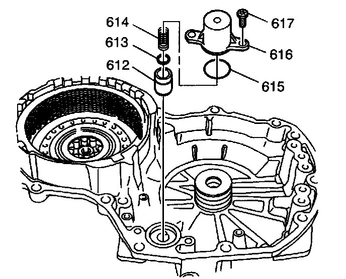 3. Install the forward clutch accumulator piston spring (614) and the forward clutch accumulator piston (612) into the forward clutch accumulator cover(616).