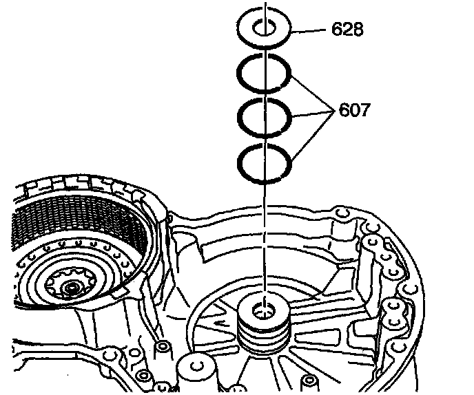Install the 3 new forward clutch housing fluid seal rings (607) and the forward/direct clutch housing thrust bearing race (628) onto the transmission case cover.