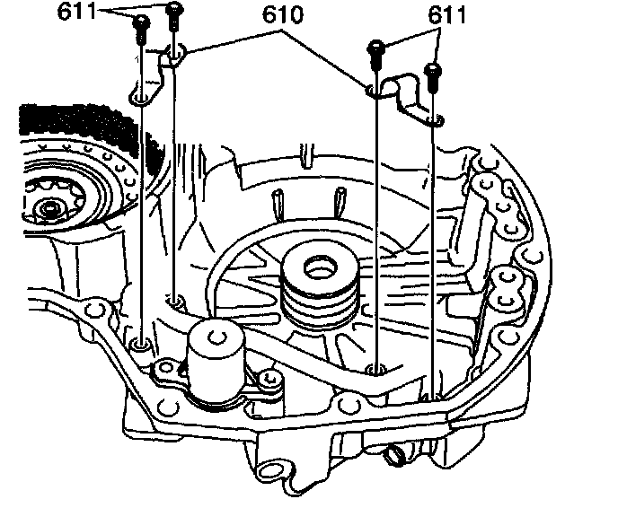 7. Install and tighten 1 of the 2 forward clutch accumulator cover bolts/screws (617).