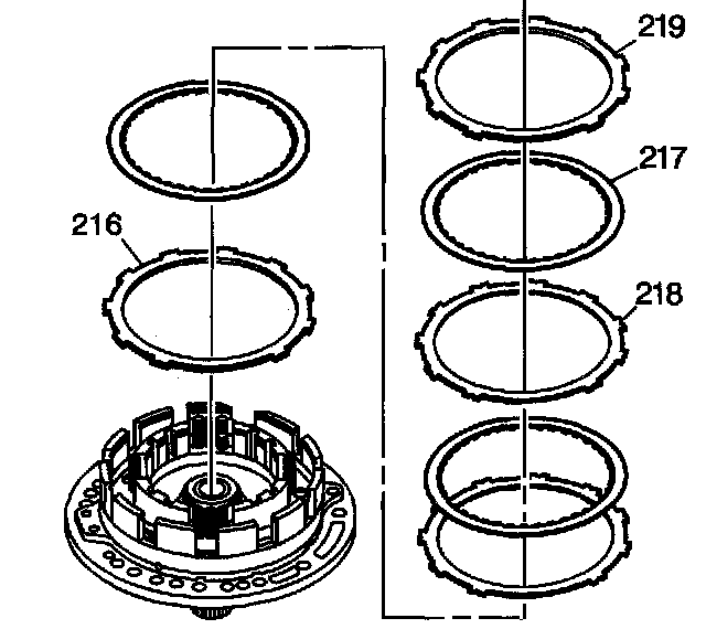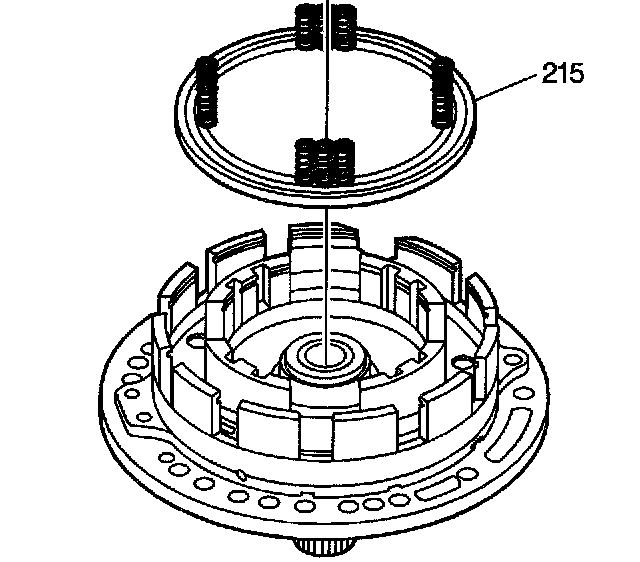 8. Install the second clutch spring assembly (215) onto the second clutch piston with the spring side up.