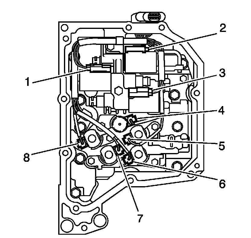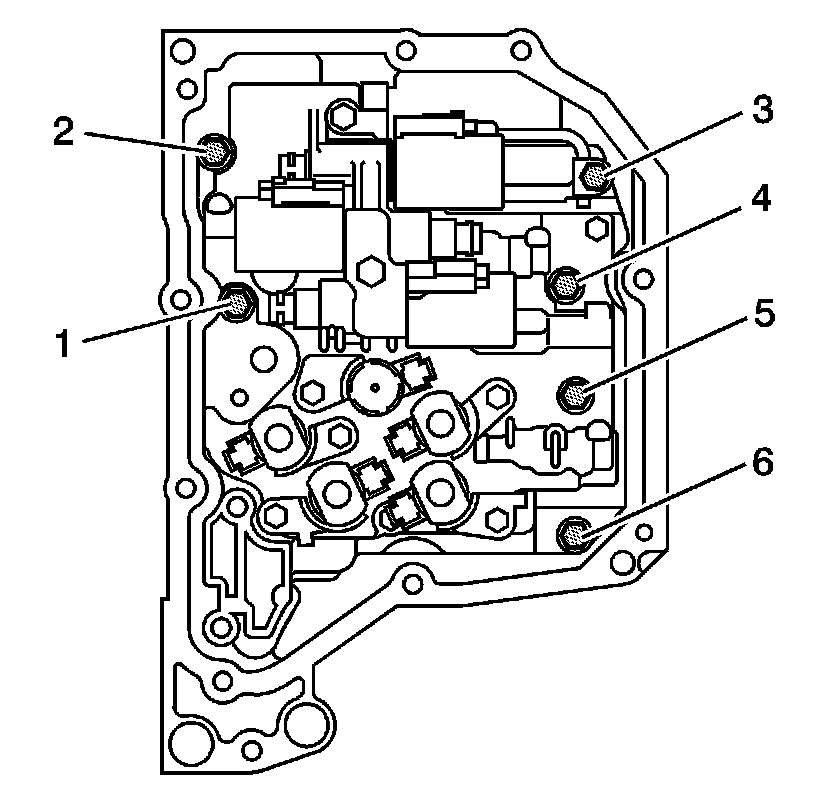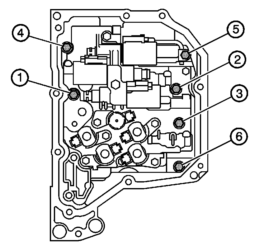 11. Remove the valve body assembly to transaxle case bolts (1, 2, 3, 4, 5, 6).