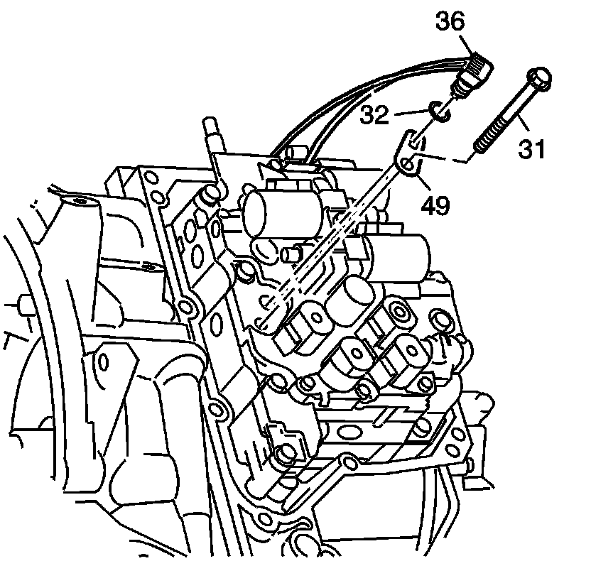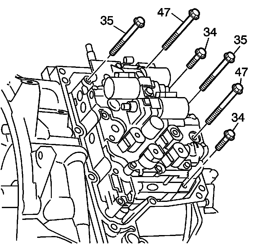 3. Install the valve body assembly to transaxle case bolts (34, 35, 47) hand tight.