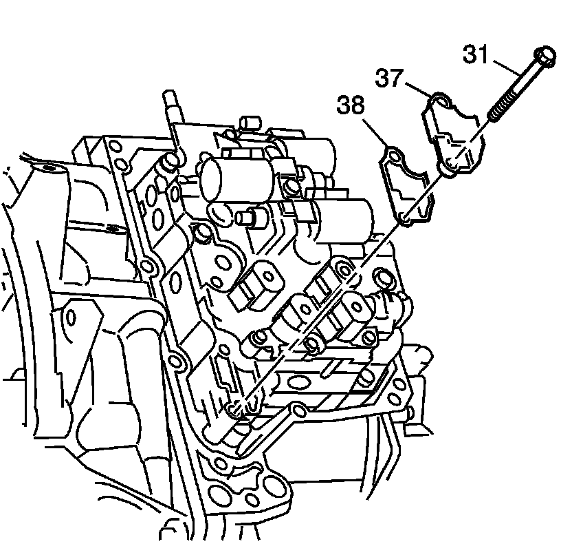 10. Remove control valve body passage cover bolts (31), cover (37) and gasket (38).