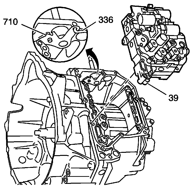 12. While holding the valve body assembly (39), disconnect the manual shift detent lever assembly (710) from the manual valve link (336).
