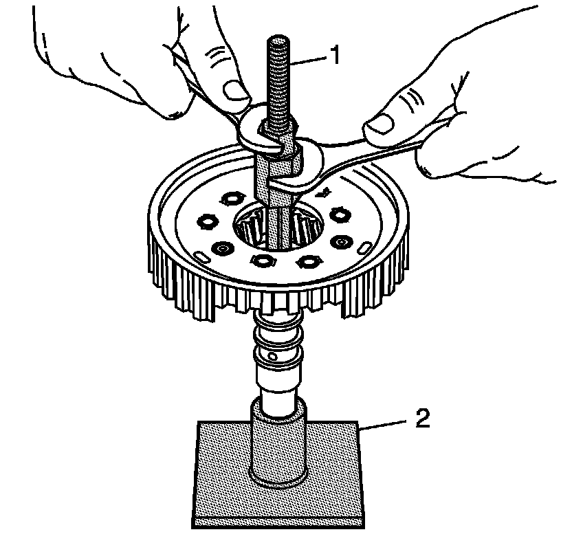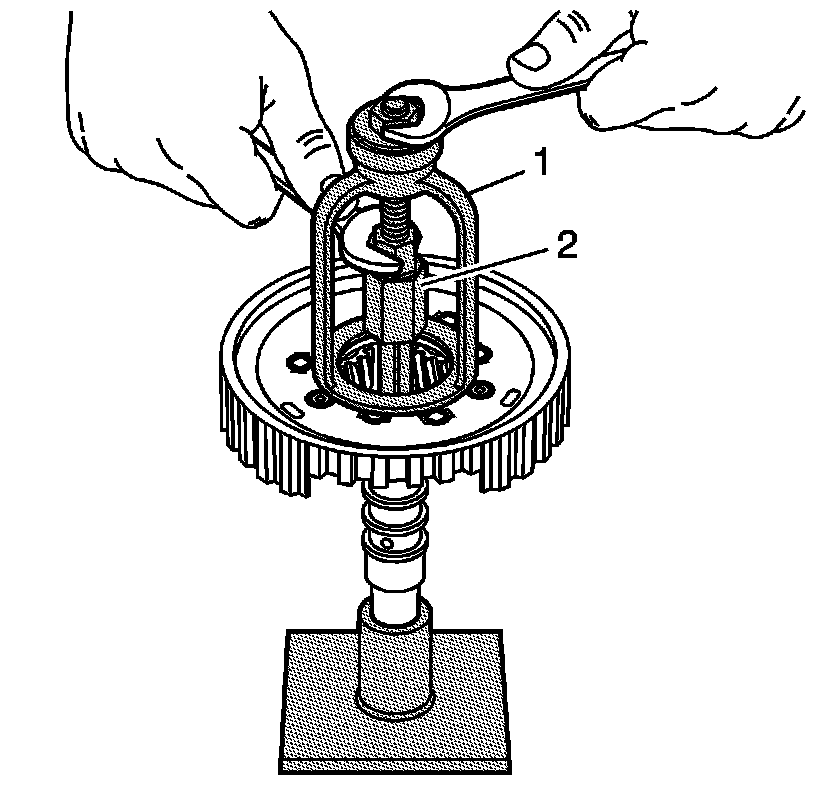 5. Using the J23456 (1) and the J43074 (2), compress the forward clutch piston spring.