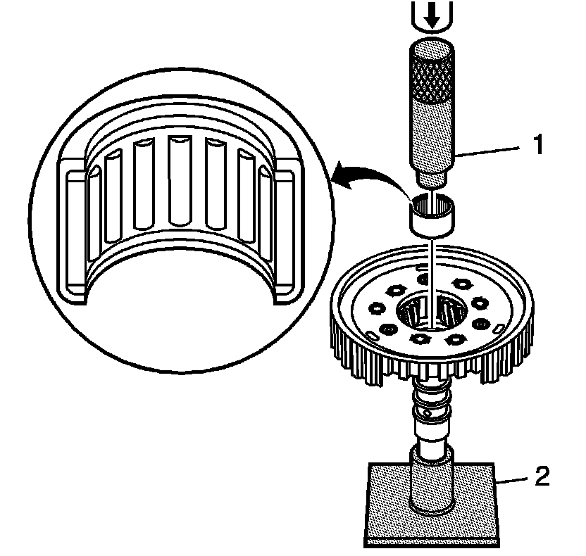 12. Using the J43074 (1) and the J44998 (2), remove the input shaft - inner - bearing assembly.