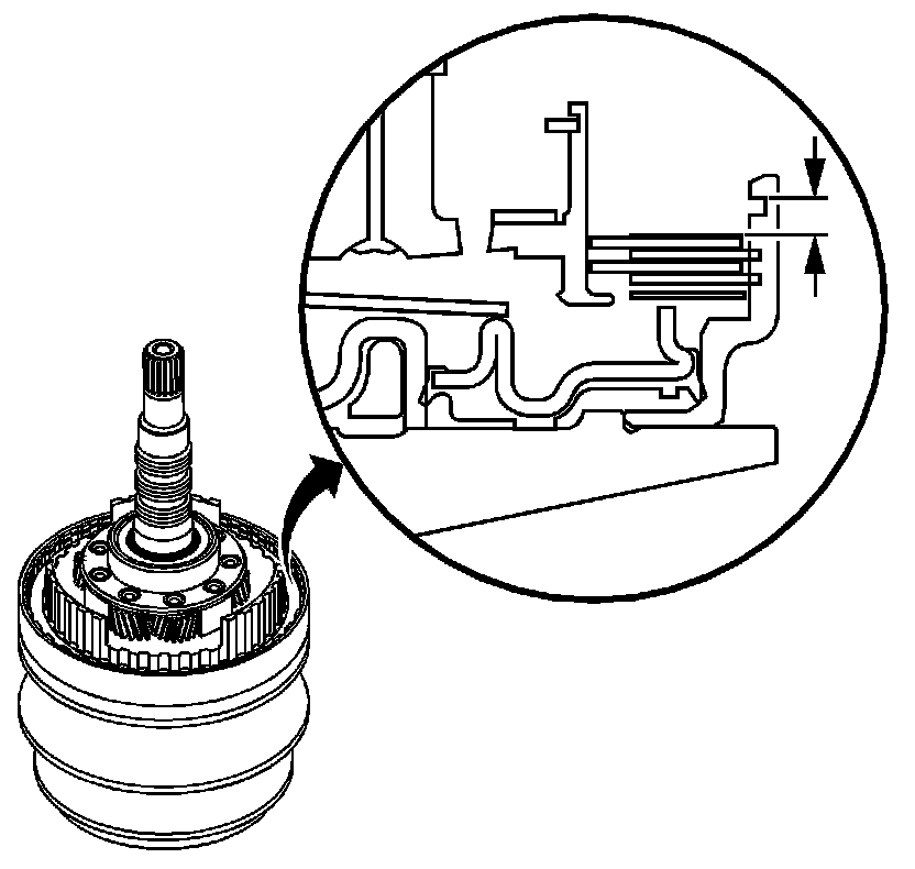 30. Measure the distance between the top outer edge of the retaining ring groove and the top friction plate. Record the measurement.