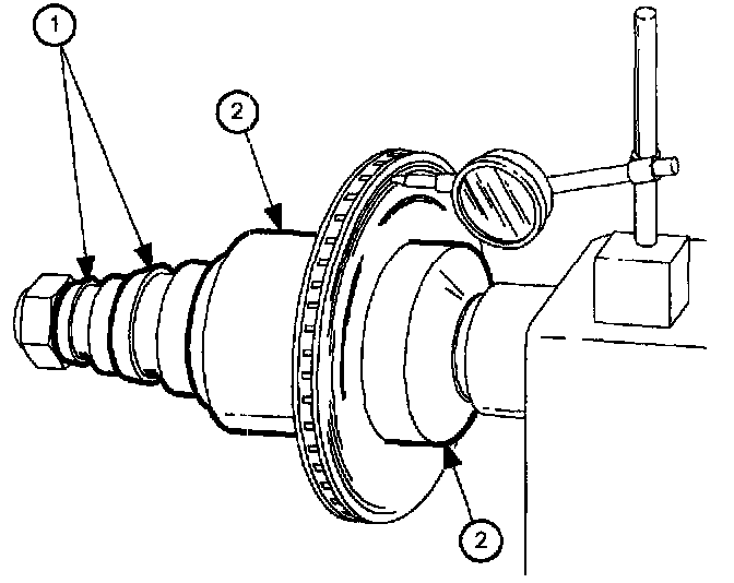 5. Use a magnetic dial indicator base and a dial indicator with graduations of one ten-thousandth of an inch (.0001 inch), or a dial indicator with graduations of 0.0025 mm to make sure rotor turns squarely on brake lathe. Attach dial indicator on brake lathe and check rotor runout. Mark highest point of lateral runout on rotor. Loosen attachment hardware and rotate rotor 180 degrees while holding inside (2) bell clamp in its original position. Tighten attachment hardware and recheck rotor runout. Any runout must follow rotor. The marked high spot must remain high spot. If not, some problem exists in attachment of rotor on brake lathe, such as bent bell clamps, incorrect bell clamps, or untrue mounting surfaces.