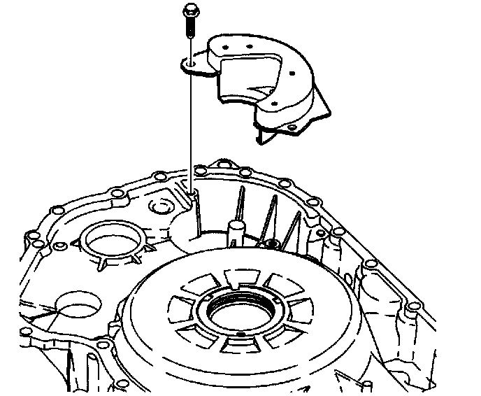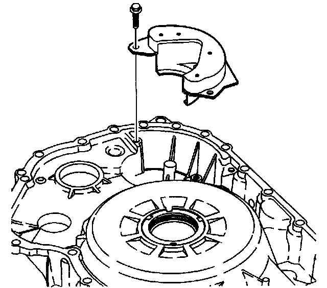 12. Remove the 3 bolts and the transmission fluid baffle from the torque converter and differential housing assembly.